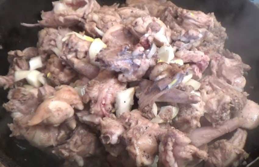 - Выкладываем на сковороду, слегка смазанную растительным маслом кусочки крольчатины. Солим, перчим. Добавляем мелко нарезанный лук, тушим четверть часа. Это делать необязательно, но так мясо получается более нежным и ароматным.