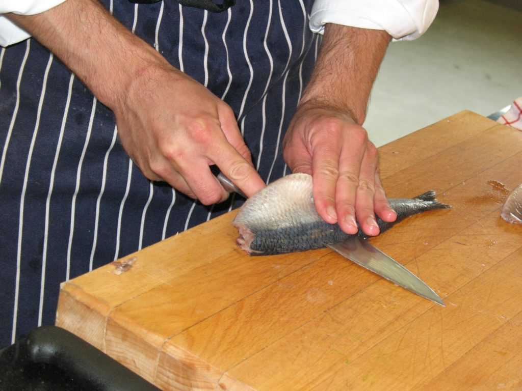На спине делают продольные разрезы по обе стороны от спинного плавника и извлекают его. Брюшные плавники вырезают ножом или ножницами. Также можно отделить узкие полоски по краям брюшка, потому что в них находится множество мелких косточек.