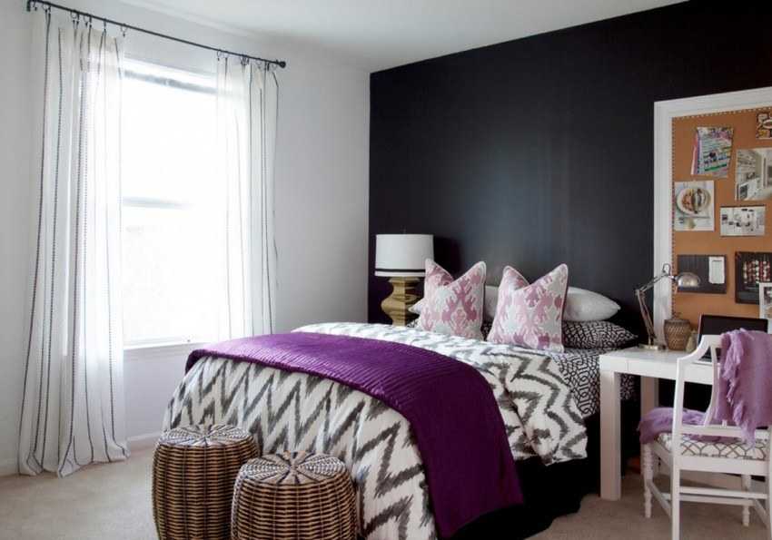- Фиолетовый. В большом количестве этот цвет действует утомляюще. Поэтому, с его помощью желательно выделять только одну из зон. Это может быть участок, который находится за изголовьем кровати или возле стола на кухне.