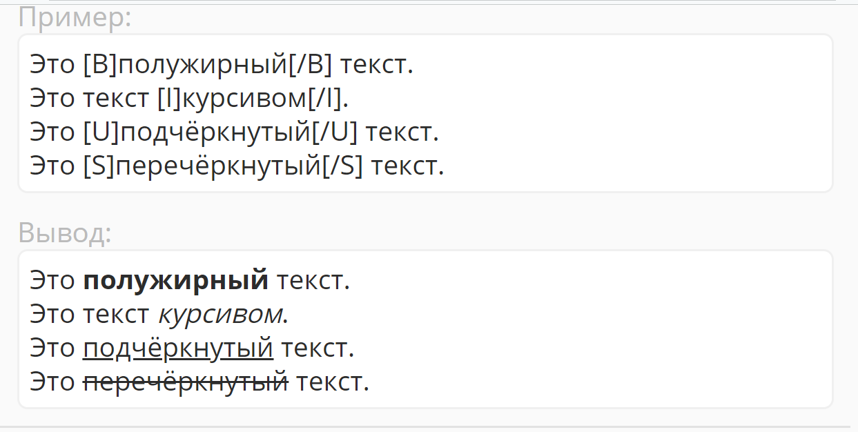 Чтобы указать подчеркнутый – использовать «__». Символы нужно ставить до текста и после него. Второй способ, как оформить текст: