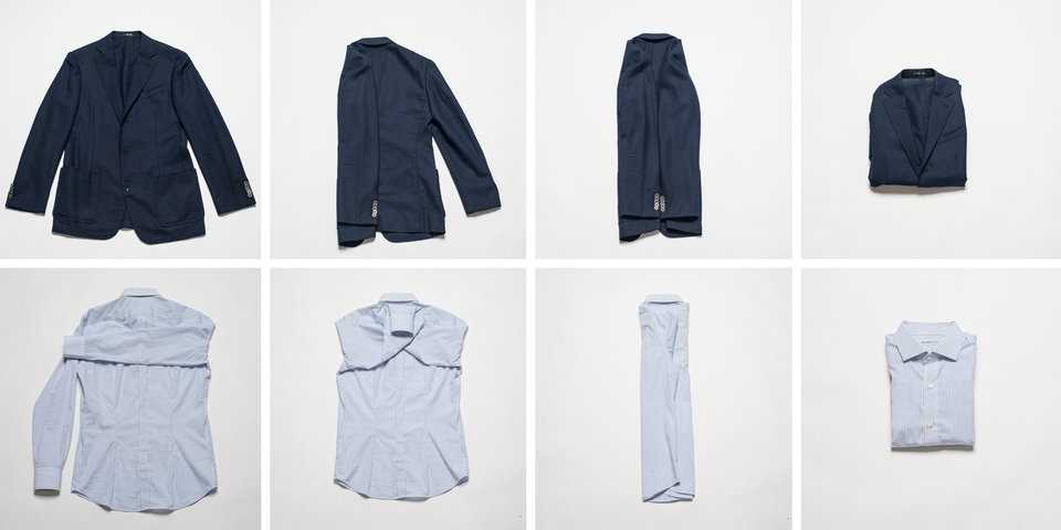 - Чтобы правильно сложить пиджак в сумку, его необходимо перевернуть вверх ногами, затем расправить складки и выпрямить плечи наружу. Это защищает ткань от пятен, и только подкладка пиджака будет сминаться, если он упакован неправильно.
