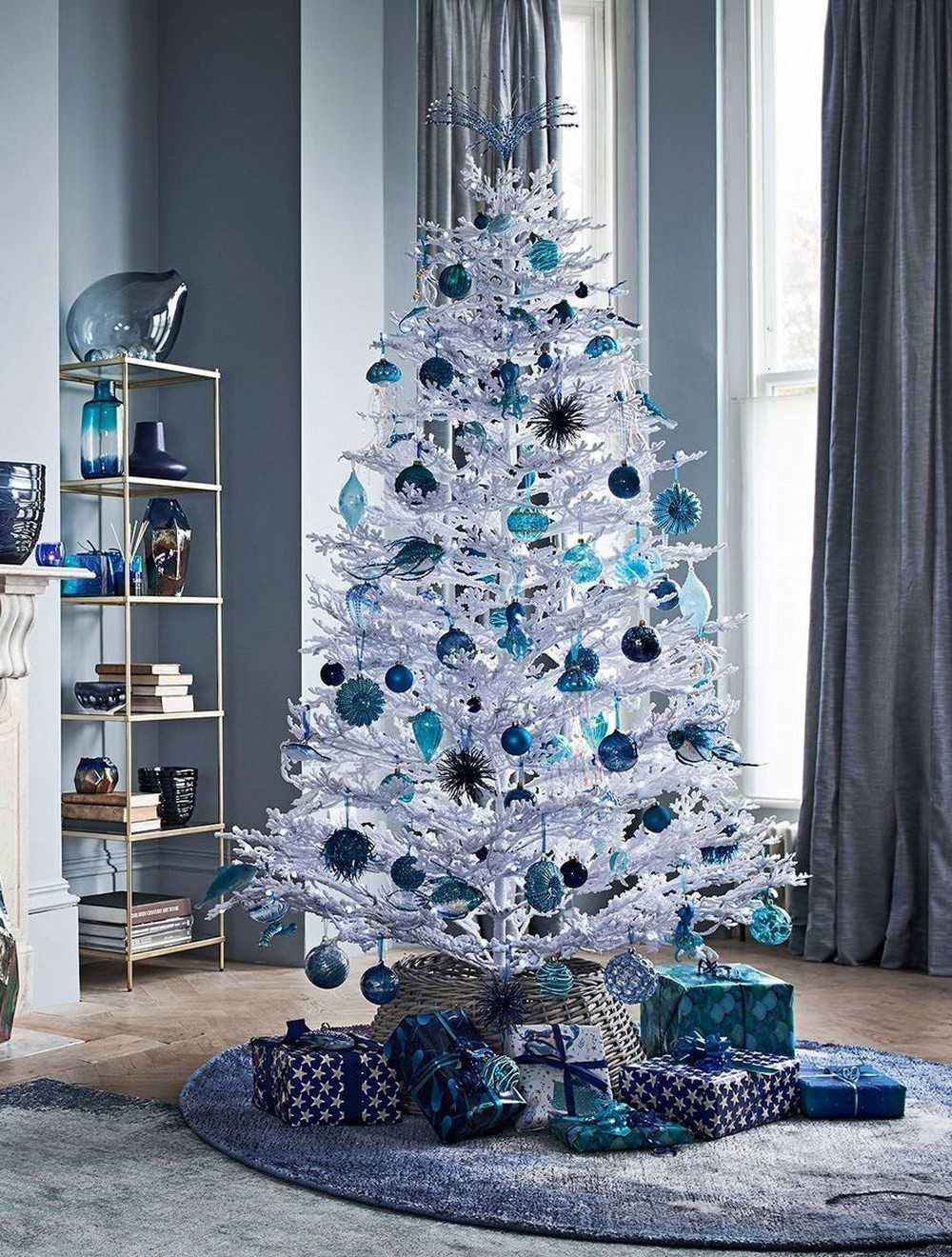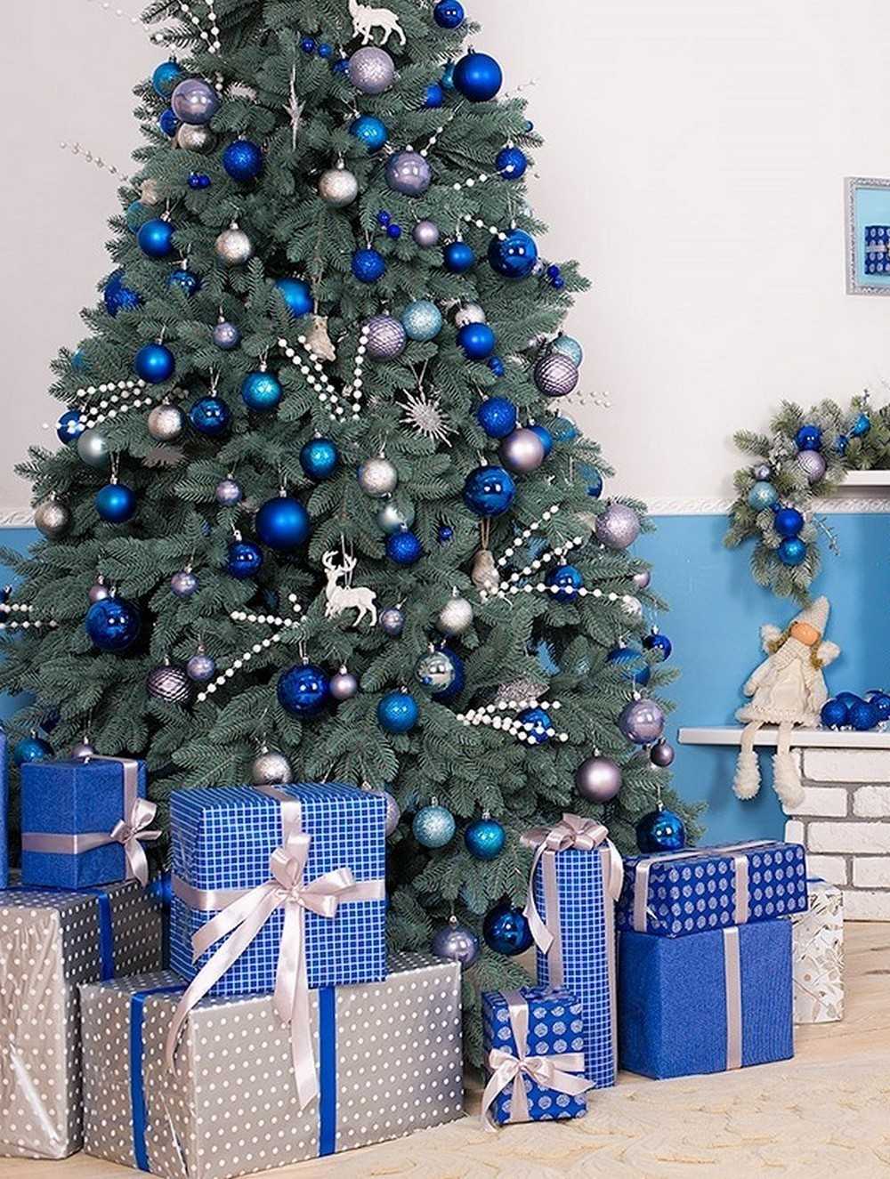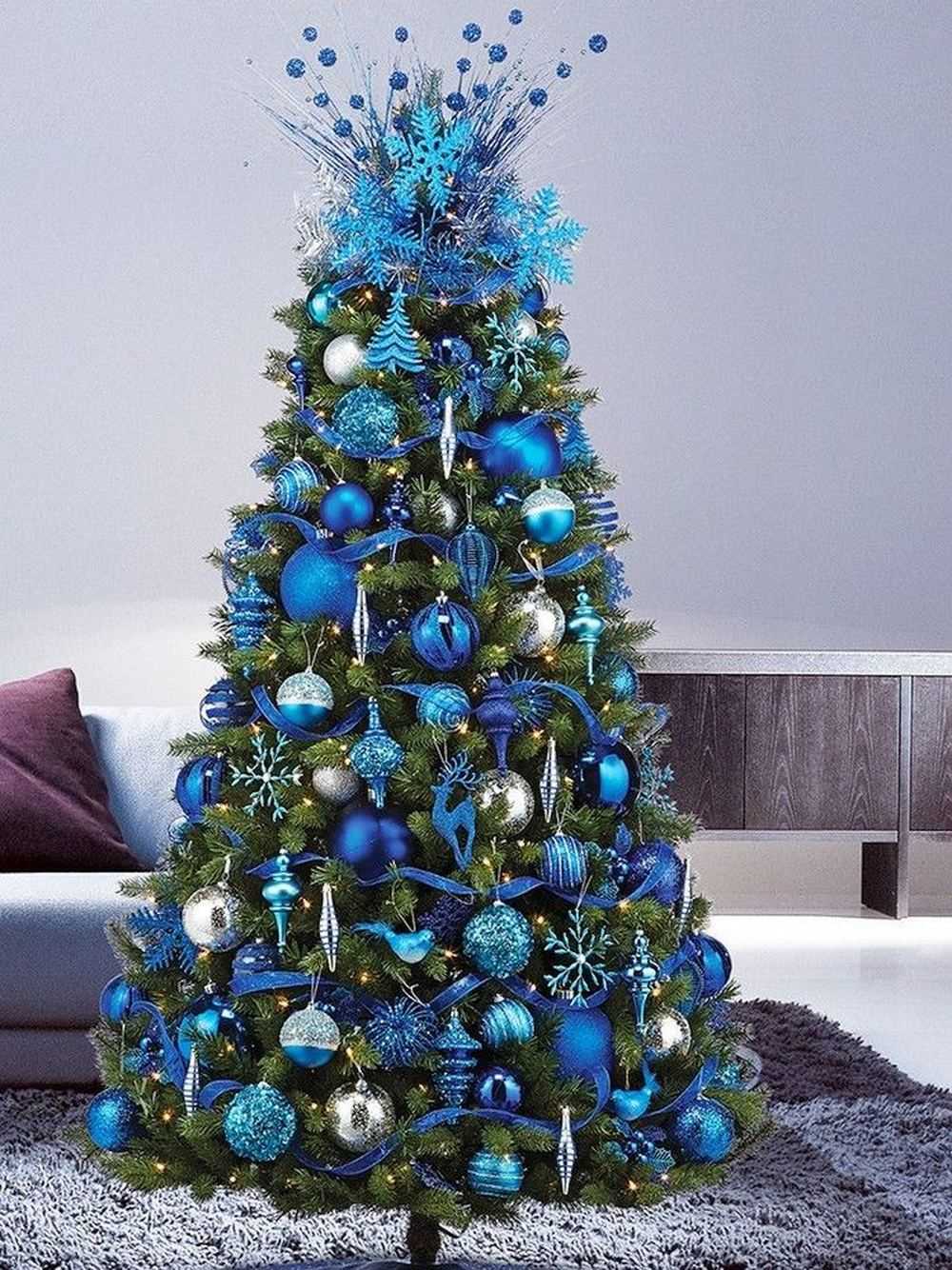 Сине-голубые игрушки эффектно смотрятся на заснеженной красавице. Классическое зимнее сочетание. Можно усыпать ветви искусственным снегом. Декор хорош как монохромный, так и со вкраплением золотисто-серебряных нитей.