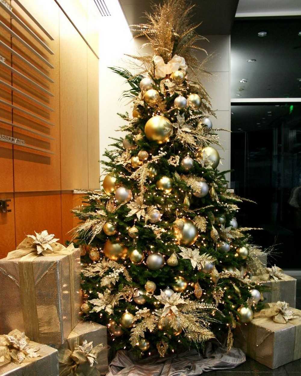 Отличный выбор — перьевые подвески и атласные ленты, струящиеся с вершины вниз, шары в сочетании со стилизованными сосульками, крупные бусы, опоясывающие ствол, роскошные банты и искусственные цветы.