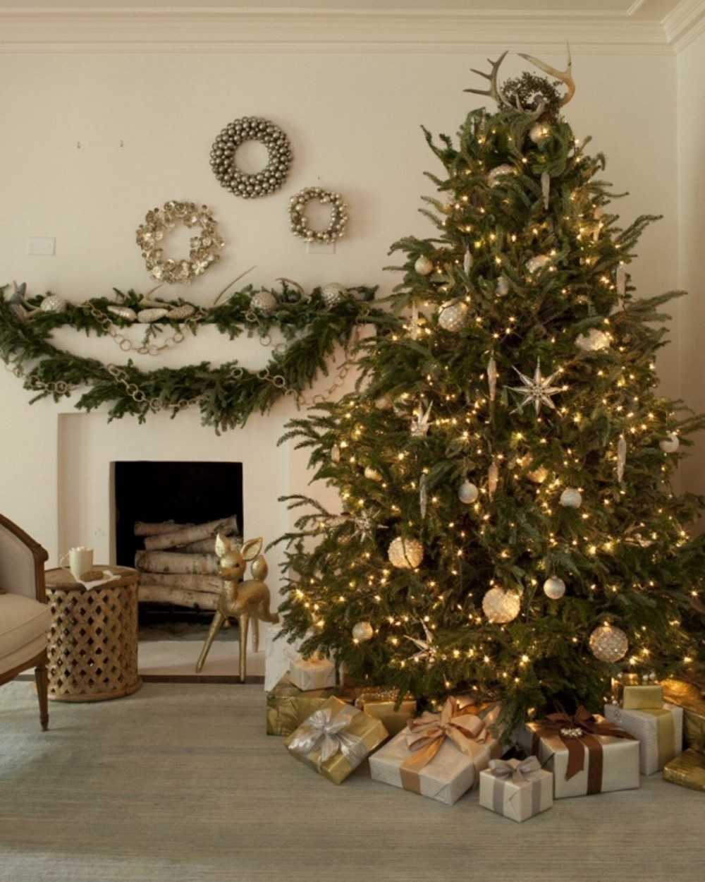 - Американский стиль. Основными будут красные, белые и золотые цвета. Непременным атрибутом служат коробки с подарками, сложенные под елкой.