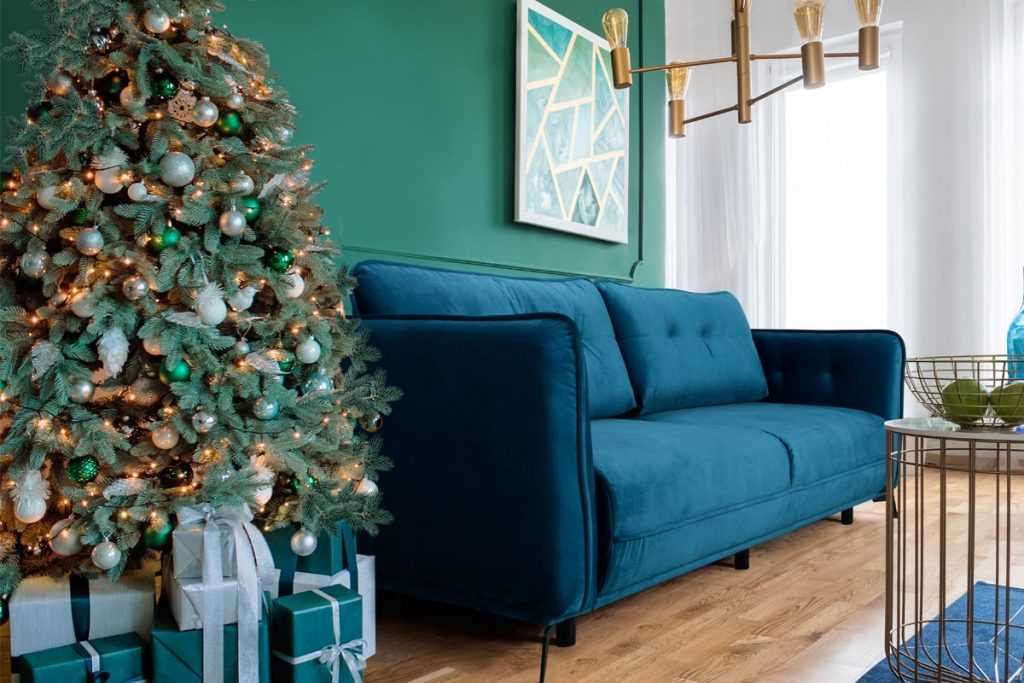 - Постелите на диван и кресла зелеными подушками и одеялами. Это не только добавит новогоднего настроения, но и создаст уют в вашем пространстве.