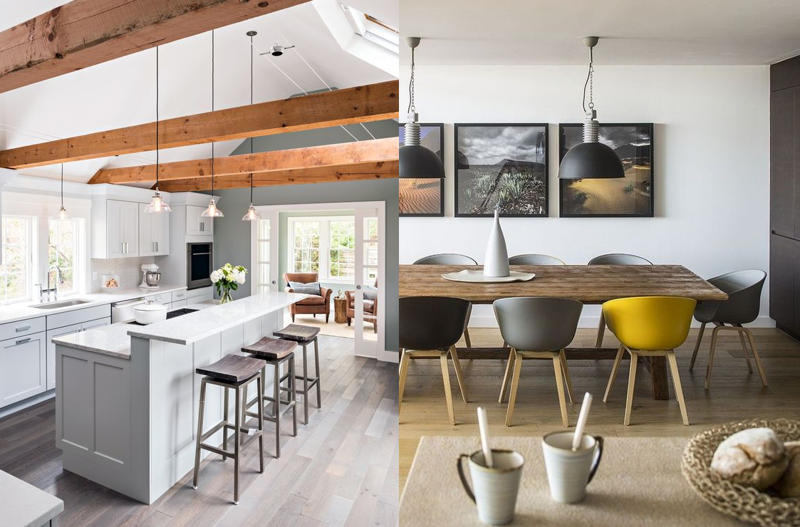 То, что называют «ритмом», в интерьере появляется за счет многократного повторения родственных или идентичных элементов. Примером могут послужить потолочные балки, колонны, арочные проёмы, одинаковые светильники или обеденные стулья. Интересный дизайнерский приём — сломать ритм, например: среди идентичных стульев может затесаться один контрастный по цвету или фактуре.