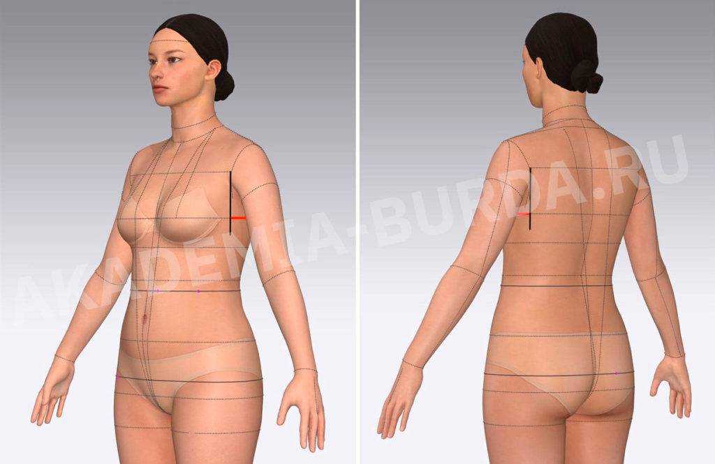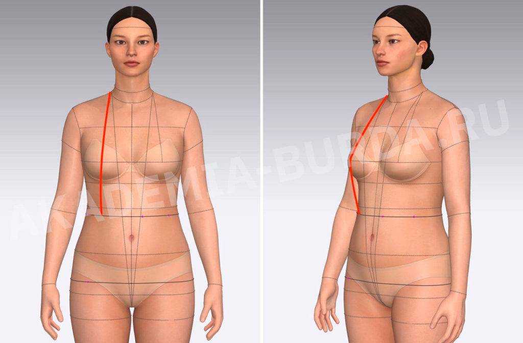 Вг (высота груди) — измеряется от высшей плечевой точки до выступающей сосковой точки. При данном измерении лучше использовать плечевую накладку.