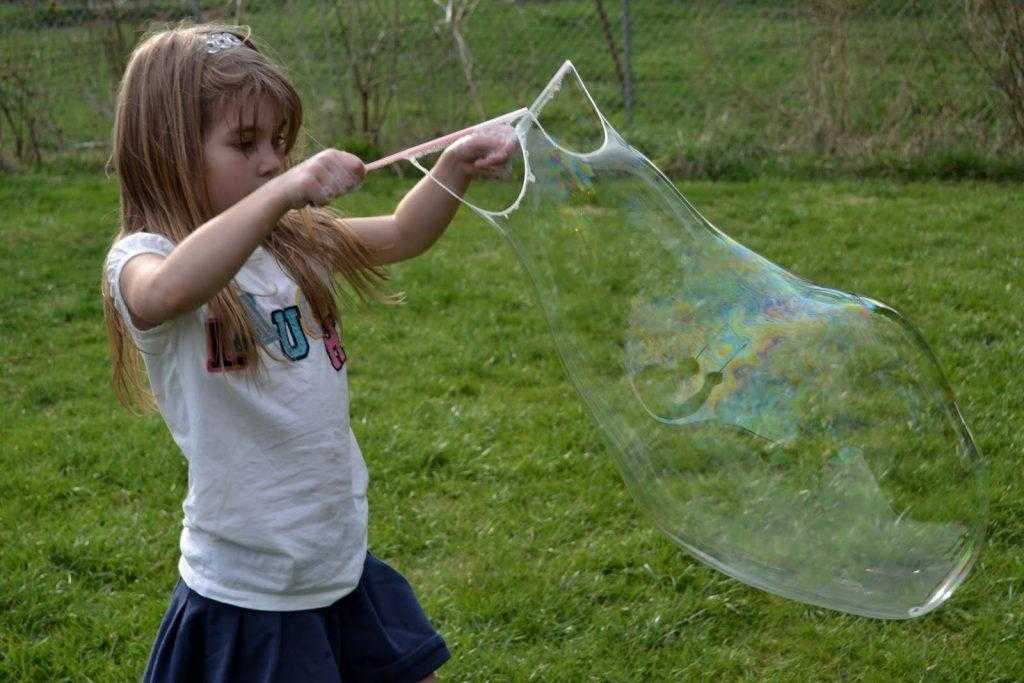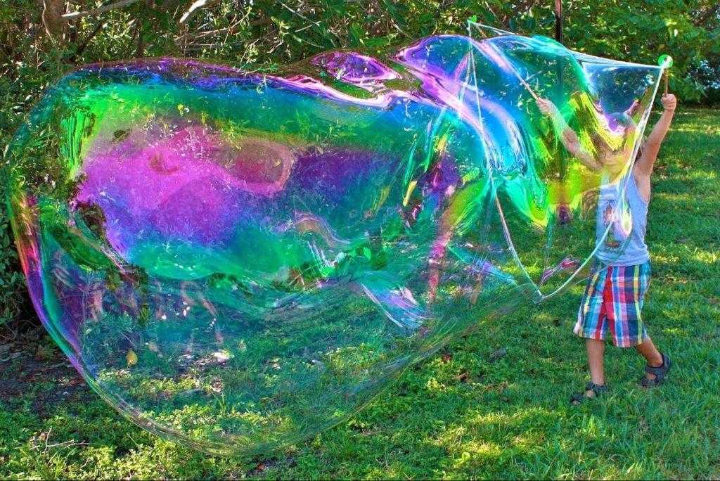 Чтобы развлечение было ещё интереснее, попробуйте сделать большие мыльные пузыри. Учитывайте, что при их выдувании площадь поверхности сферы увеличивается. При этом количество раствора, из которого она выдувается, остаётся прежним. Поэтому мыльная плёнка становится всё тоньше — чтобы пузырь был большим, она должна быть максимально устойчивой при минимальной толщине. Добиться необходимой устойчивости можно с помощью специальных ингредиентов — глицерина, желатина, сахара.