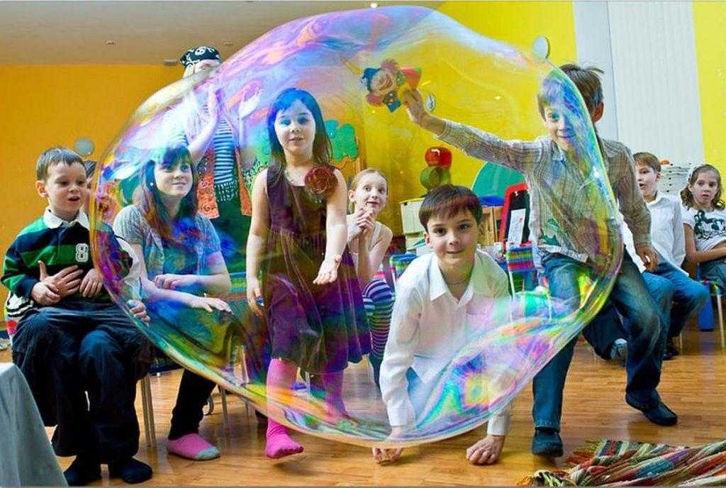 На детском празднике несложно устроить эффектное шоу с использованием гигантских мыльных шаров. Для этого в детский бассейн наливают подготовленную смесь и устанавливают туда небольшую табуретку. Вокруг стульчика в раствор укладывают обруч, обмотанный тканью. Когда обмотка хорошо пропитается, на табуретку ставят ребенка и быстро поднимают вверх обруч. В итоге гость оказывается в «коконе» из мыльного пузыря. Если действо дополнить музыкой, то получится настоящее представление.
