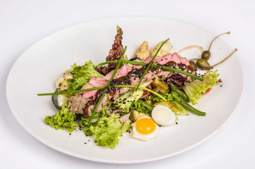 При подаче на плоскую тарелку выложить листья латука и готовый салат. Сверху украсить блюдо каперсами, анчоусами, маслинами, яйцами и щедро заправить соусом.