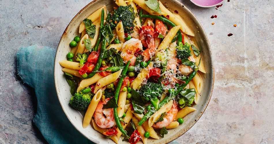 Ужин. Паста из твердых сортов пшеницы с креветками и зелеными овощами. На десерт — яблоко.