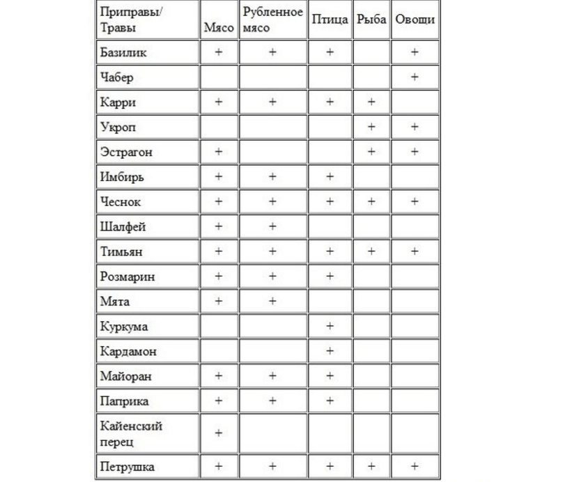 В заключение хочется привести таблицы совместимости соусов и приправ с мясными и рыбными блюдами, дабы хозяйки не допускали ошибок при выборе дополнения к своим кулинарным шедеврам.