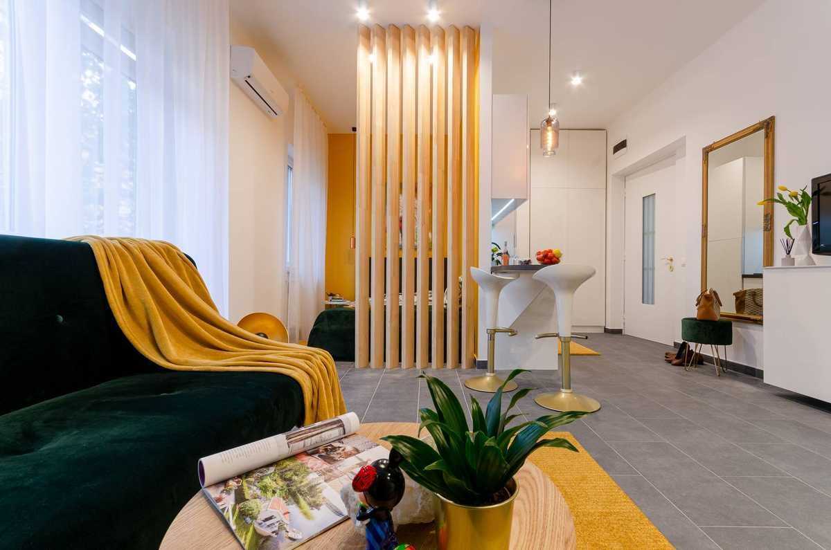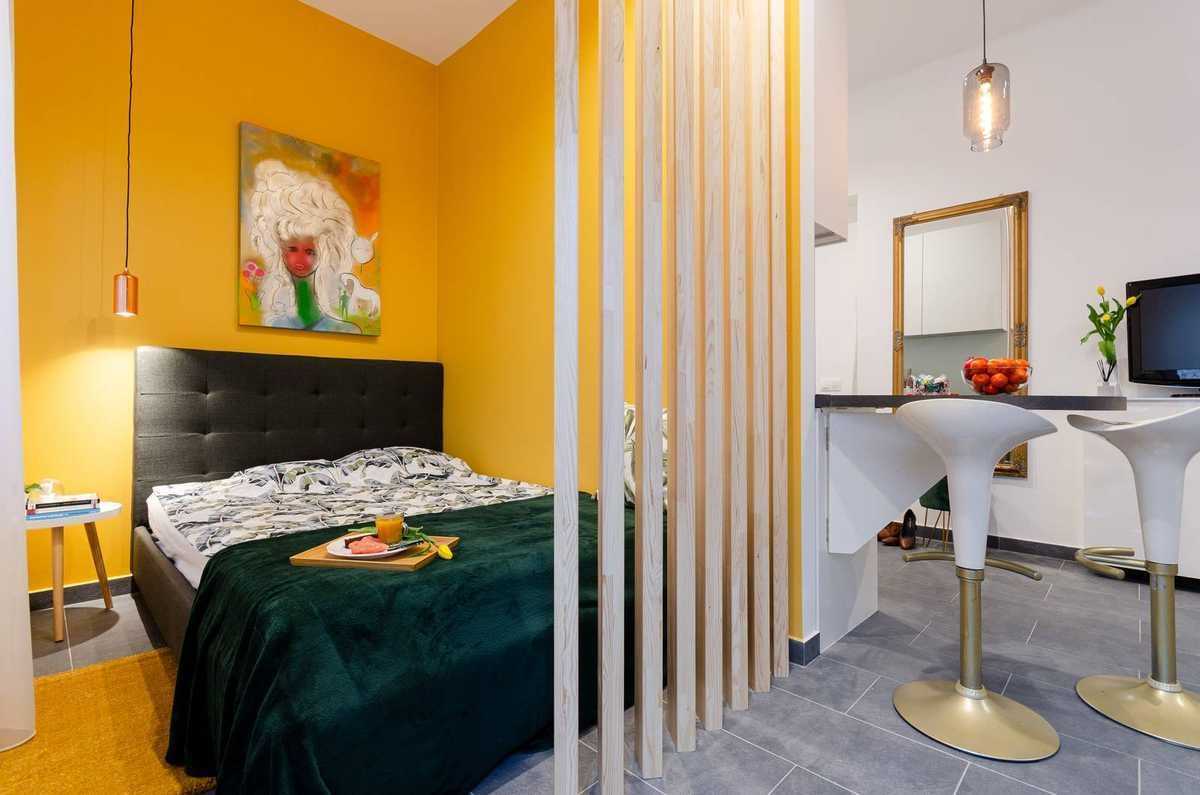 На фото приведён пример студийной квартиры площадью 33 м2, в столь малом пространстве дизайнер просто вынужден как-то отгораживать кровать, чтобы создать удобный интерьер. Угол, в котором расположена кровать отделён реечной деревянной перегородкой. Также здесь применено и визуальное зонирование: стены в спальном уголке покрашены в ярко-жёлтый цвет, резко контрастирующий с белыми стенами в квартире.