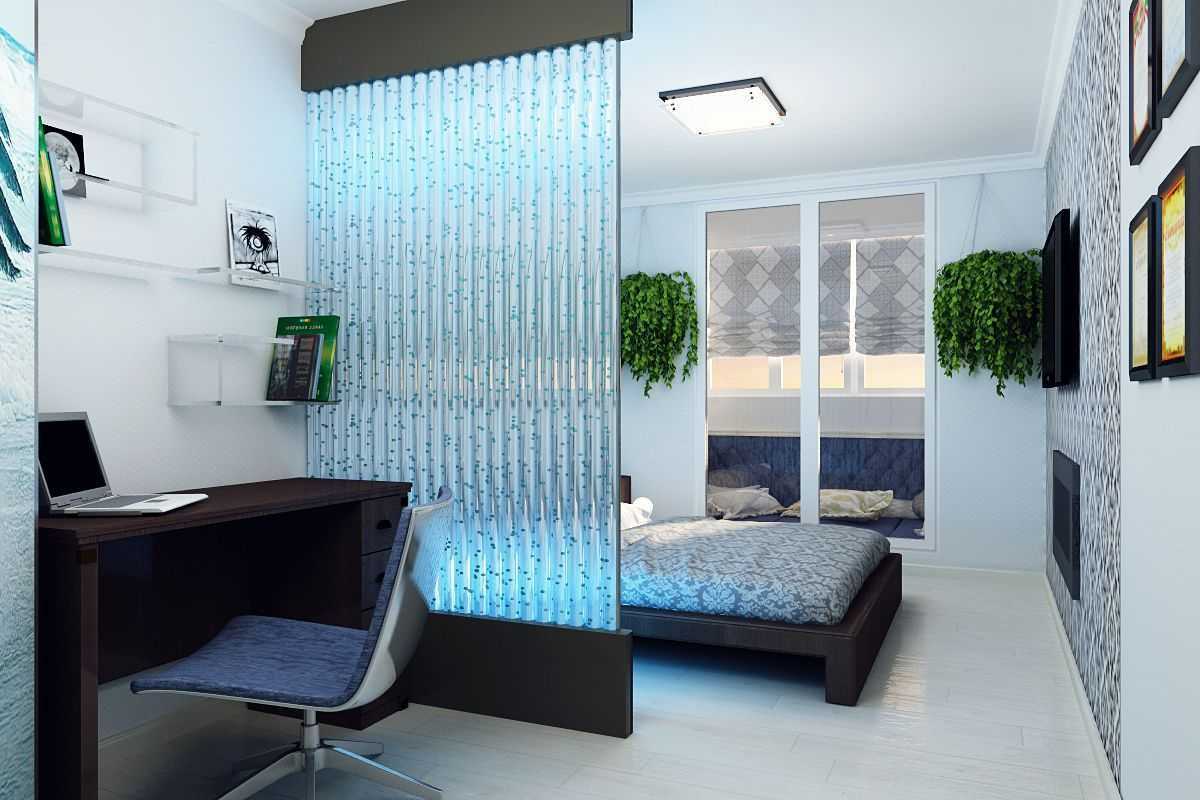 Спальни в 12, 14, 16 кв. м. допустимо зонировать небольшими перегородками. В комнате с одним окном актуально планировать невысокие стеллажи, высотой 900-1200 мм, длиной 1600-2500 мм, таких размеров в полной мере хватает для отделения зоны сна. Они могут послужить местом для книг и мелочей, на верху целесообразно оборудовать барную стойку или установить аквариум.