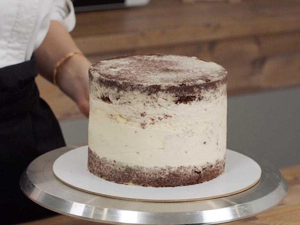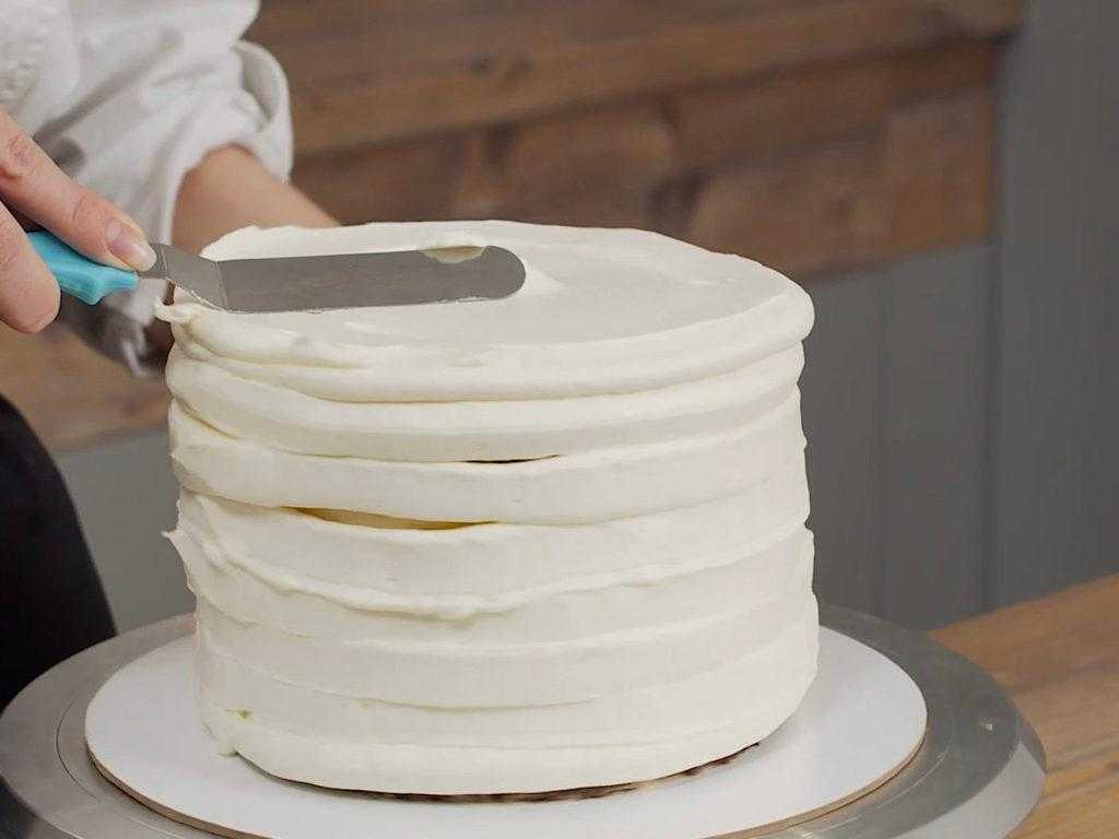 - Перед нанесением крема для выравнивания обязательно нужно охладить торт: 6 часов или ночь в холодильнике. Это необходимо для принятия им окончательной формы и скрепления всех элементов сборки. Крем тоже нужно предварительно охладить. Если вы пока что работаете медленно, то убирать крем в холод потребуется несколько раз в процессе выравнивания. Подробную инструкцию по сборке тортов можно посмотреть тут.