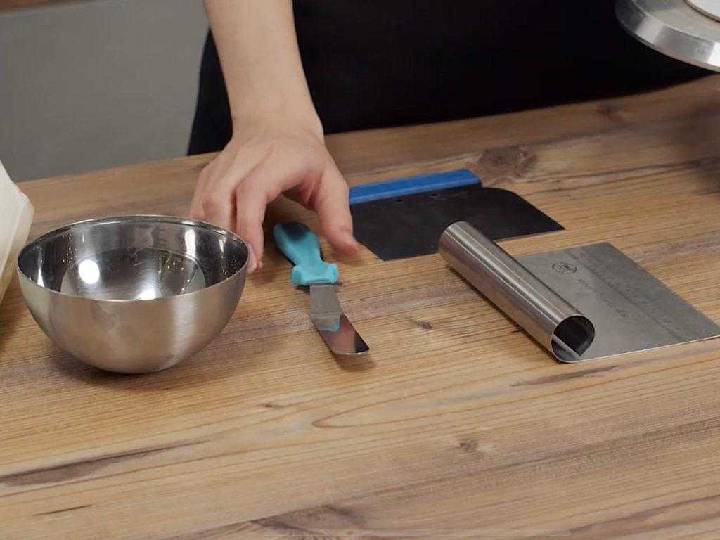 Сначала необходимо подготовить все материалы и рабочее место. Для того, чтобы выровнять торт вам понадобится всего 4 предмета: поворотный столик, ровный металлический шпатель, спатула и небольшая чаша для того, чтобы убрать лишний крем. И такие расходные материалы, как, кондитерские мешки (лучше подобрать несколько), салфетки, подложка для торта. Итак, давайте обо всем поподробнее.