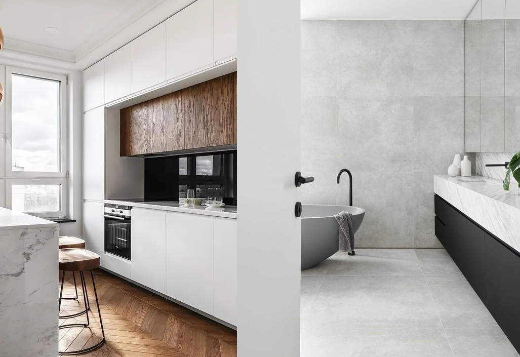 Постсоветские интерьеры были далеки от минимализма. Времена товарного дефицита и однообразия сменились яркой порой евроремонтов, когда все заморские новинки с энтузиазмом примерялись на российские реалии: декоративный камень облеплял углы и арочные проёмы, потолки обрастали многоярусными гипсокартонными конструкциями, фотопечать украшала кухонные фартуки и фасады новомодных шкафов-купе. Постепенно эра интерьерного изобилия уступила место моде на минимализм, которая тоже пришла из-за рубежа.