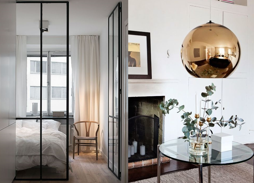 Комната должна казаться просторной и свободной, поэтому важно с умом выбирать элементы интерьера. Зонировать пространство можно при помощи легких складных ширм или стеклянных перегородок