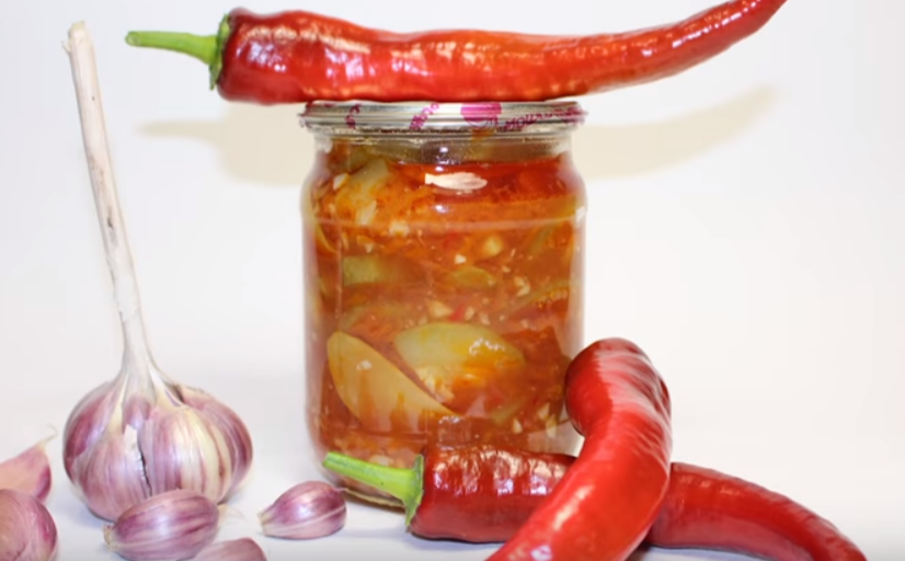 В отличие от салата из баклажанов, это блюдо отличается более мягким вкусом. Ароматную и остренькую закуску можно быстро приготовить в любой свободный день. Если хотите сделать на зиму несколько банок жгучего блюда, то количество, указанных продуктов, увеличивайте пропорционально.