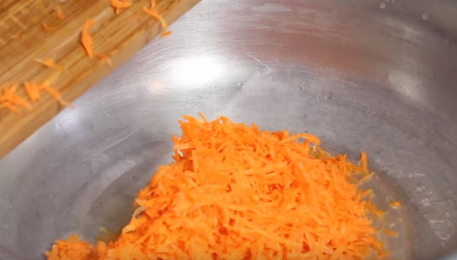 Для приготовления острой корейской закуски молодые и плотные кабачки моют, а затем натирают на терке, которая предназначается для создания популярного салата «Морковча». Аналогичным образом обрабатывают и свежую очищенную морковь. Далее овощи смешивают в большой таре и посыпают солью (для начала берут одну десертную ложку). После этого к ним добавляют сахар. В таком составе продукты тщательно мешают. При этом овощи слегка сжимают кулаком, чтобы они скорее пустили сок.