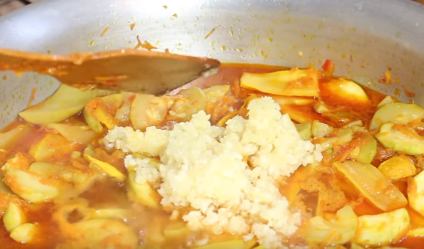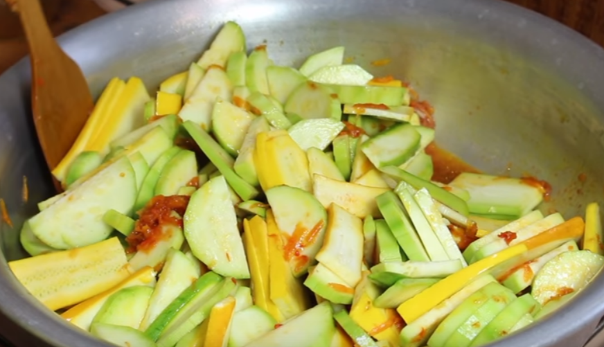 После термической обработки лука к нему добавляют немного молотого кориандра и перец чили. Также в горячую сковороду вливают яблочный уксус. В таком составе ингредиенты тщательно мешают, после чего выкладывают к овощной смеси из кабачков и моркови.