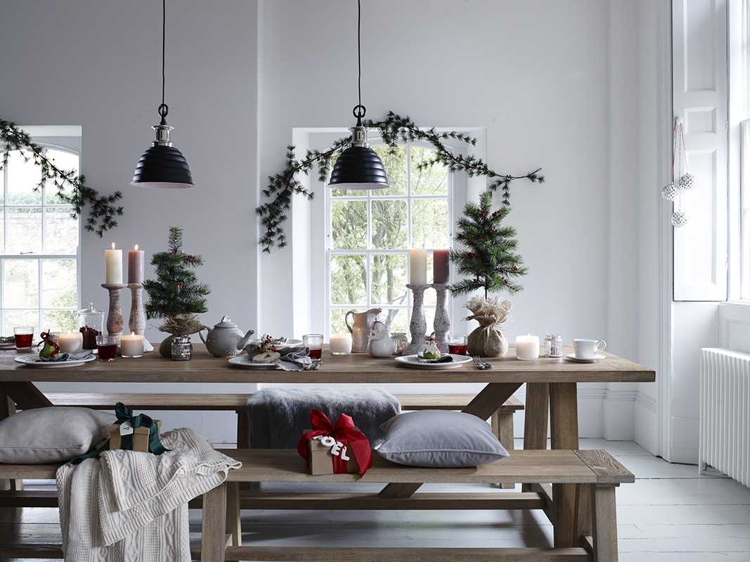 Украшение необходимо начинать со скатерти, по центру стола размешают декор – это может быть венок или подсвечник. При оформлении можно использовать праздничную гирлянду.