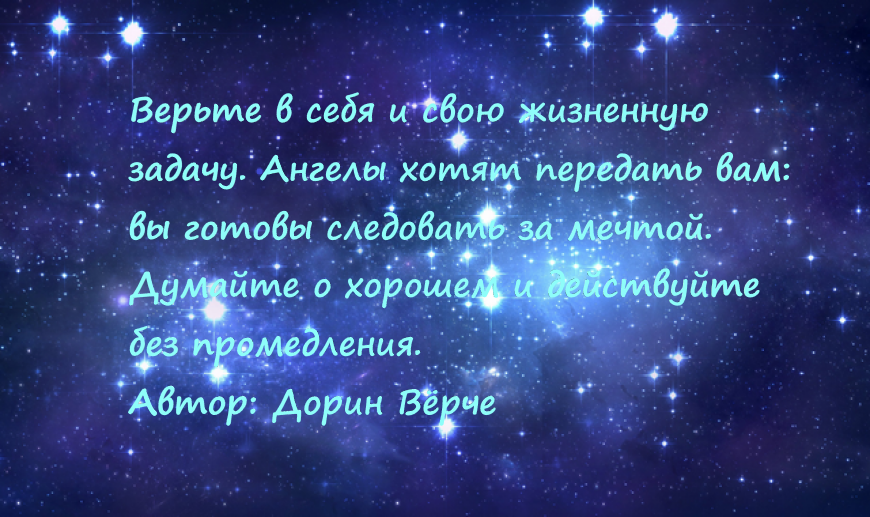 Оставайтесь оптимистичными, даже если жизнь ставит преграды. Чем дальше вы будете продвигаться, тем легче будет становиться. Помните для чего начинался ваш путь. Будьте спокойны и собраны. Такое поведение поможет легче принимать возникшие трудности. Не переживайте, их будет немного, потому что ангел-хранитель находится рядом с вами.