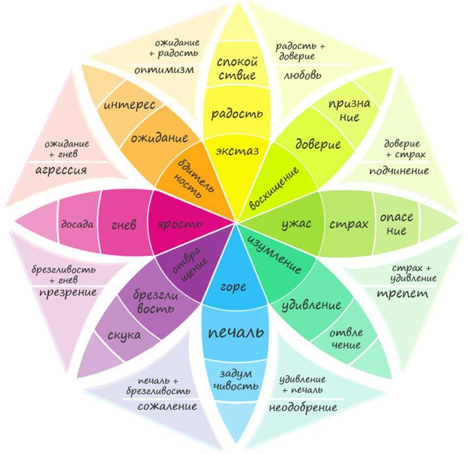 Для осознания всего спектра эмоций можно изучить колесо эмоций Роберта Плутчика (Robert Plutchik). Оно наглядно показывает, насколько широка палитра чувств. С его помощью можно изучить взаимосвязи между эмоциями, степень их интенсивности и понять, откуда берутся сложные эмоциональные состояния.