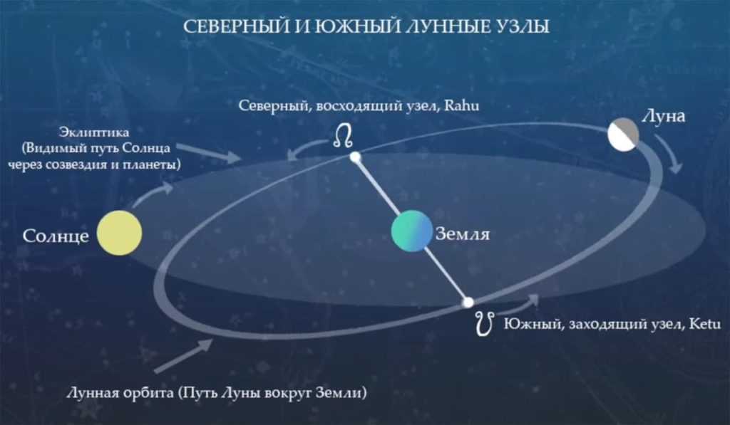 Лунными узлами называются две противоположные точки пересечения орбит Луны и Земли. Одна из них называется Нисходящий Южный узел, другая — Восходящий Северный узел. В натальной карте они всегда находятся в оппозиции друг к другу. Их полный цикл обращения составляет 18,68 лет. Проанализировав, в каких знаках они находятся, и какие аспекты образуют с другими планетами гороскопа рождения, можно определить кармические задачи, которые предстоит выполнить в этой жизни.