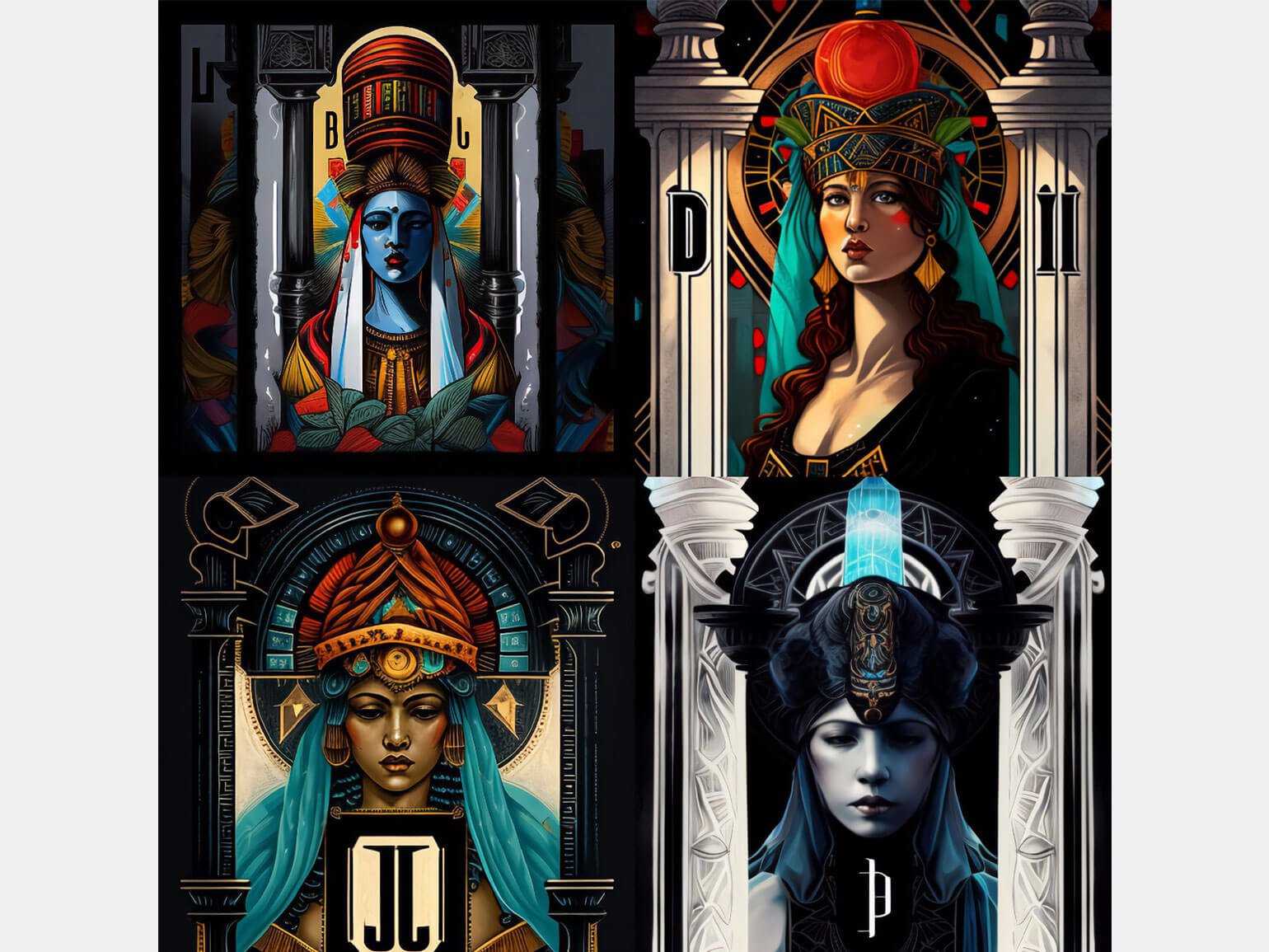 Промпт для Midjourney, которым поделился Кац: Цветная карта Таро. Карта Таро Верховная жрица. Экзотическая женщина. Экзотический головной убор. Средневековый. Освещённый. По обе стороны от Верховной жрицы две большие колонны. Они отмечают вход в это мистическое место. Одна колонна чёрная с буквой B, другая белая с выгравированной буквой JИзображение: Midjourney / Marcus Katz / The World of Playing Cards