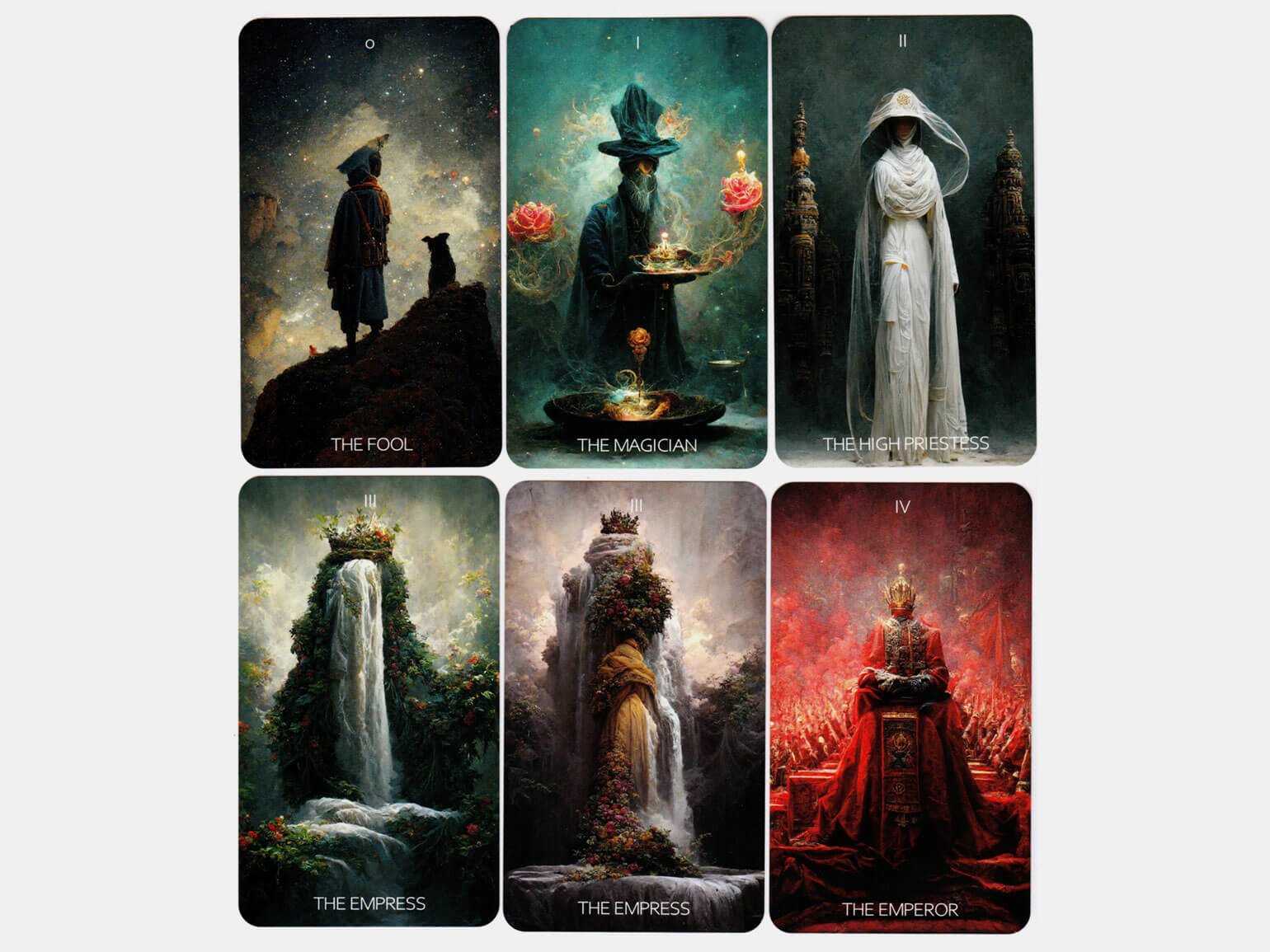 Первую карту создавал итальянский художник эпохи Возрождения, предположительно Бонифачо Бембо. Он работал над колодой с целым цехом подмастерий. Вторую карту создал Маркус Кай совместно с нейросетью Midjourney, собрав деньги на проект при помощи краудфандинга.