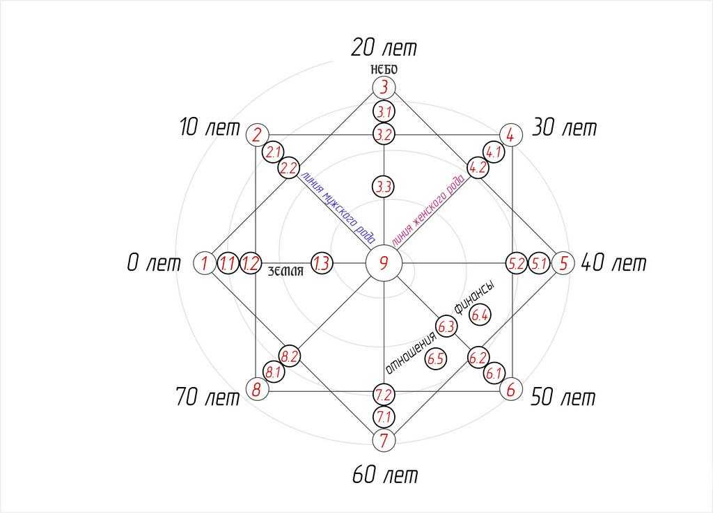 Учитывайте, что указанные номера кружков – это не готовые цифры, а лишь место, где их можно найти. Цифры будут формироваться индивидуально, исходя из вашей даты рождения. Расчет всегда начинают с первого главного кружка под номером 1, вписывая туда свою дату рождения.