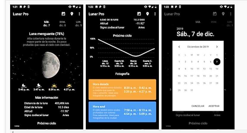 С другой стороны, в My Moon Phase есть раздел, показывает время золотого часа и синего часа, чтобы вы знали, когда лучше всего делать снимки. Другое дело, что он сообщает соответствующие данные, такие как высота определенной точки в определенную дату, расстояние между Луной и Землей и возраст Луны. Также доступны уведомления, которые вы можете получать, когда луна находится в выбранной вами фазе.