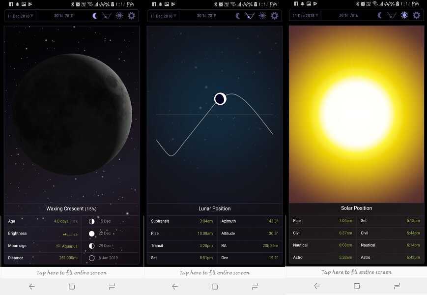 Помимо луны, вы также можете видеть положение Солнца/Солнца из самого этого приложения. Единственным недостатком этого приложения является то, что оно покажет вам текущую фазу луны только на текущий день. Чтобы иметь доступ к разным дням, вам нужно будет купить их премиальные планы.