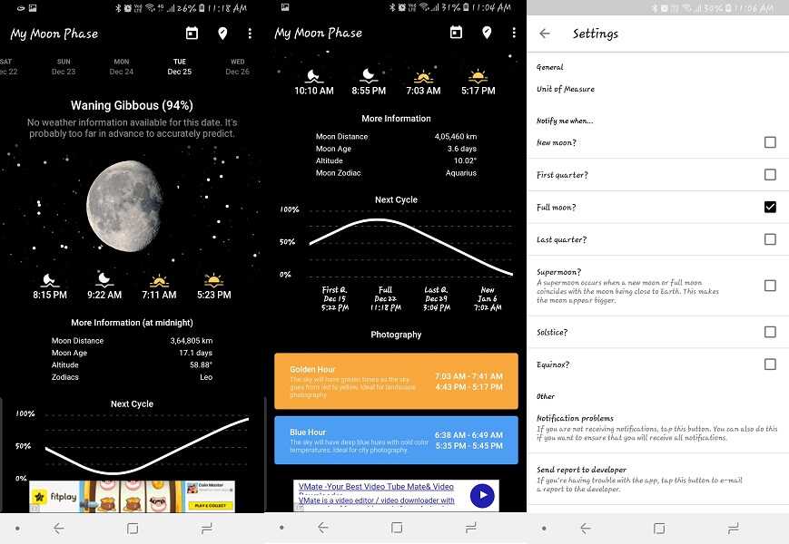 Вы увидите график с датой полнолуния и других фаз. Кроме того, в этом приложении указано время для Золотого часа и Синего часа для фотографов. И вы также будете получать уведомления о различных событиях луны, таких как полнолуние, новолуние, суперлуние, солнцестояние и некоторые другие.