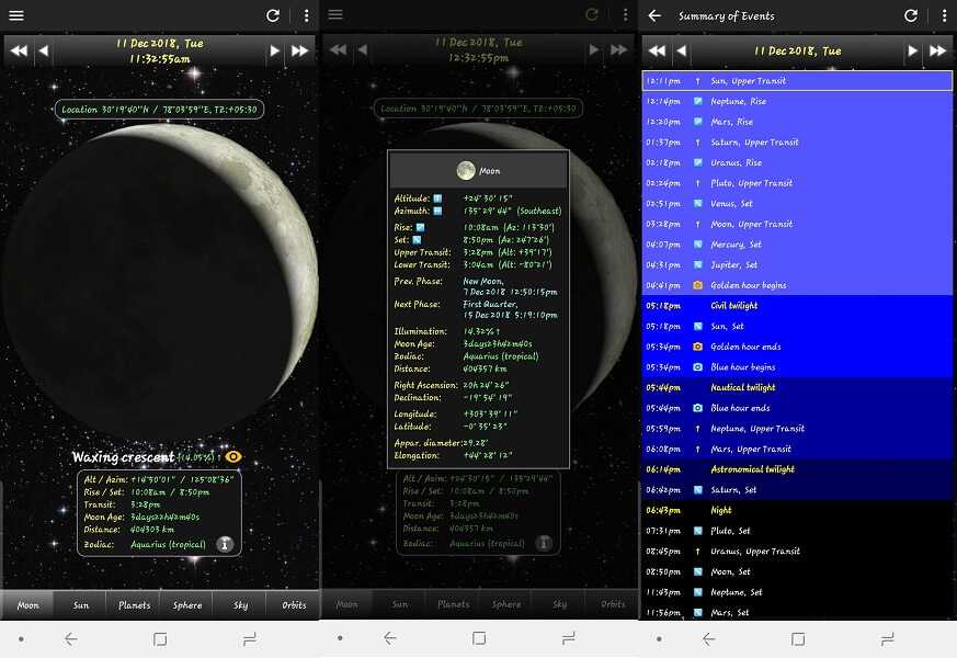 Вы можете видеть информацию о дате о различных событиях, таких как суперлуние, затмение, время восхода и захода солнца и луны и т. д. Помимо луны, вы также можете получить информацию о солнце, небесных орбитах и т. д. другие планеты. Он также позволяет настраивать уведомления для различных фаз и событий луны, если вы хотите. Единственным недостатком является то, что он доступен только для пользователей Android.