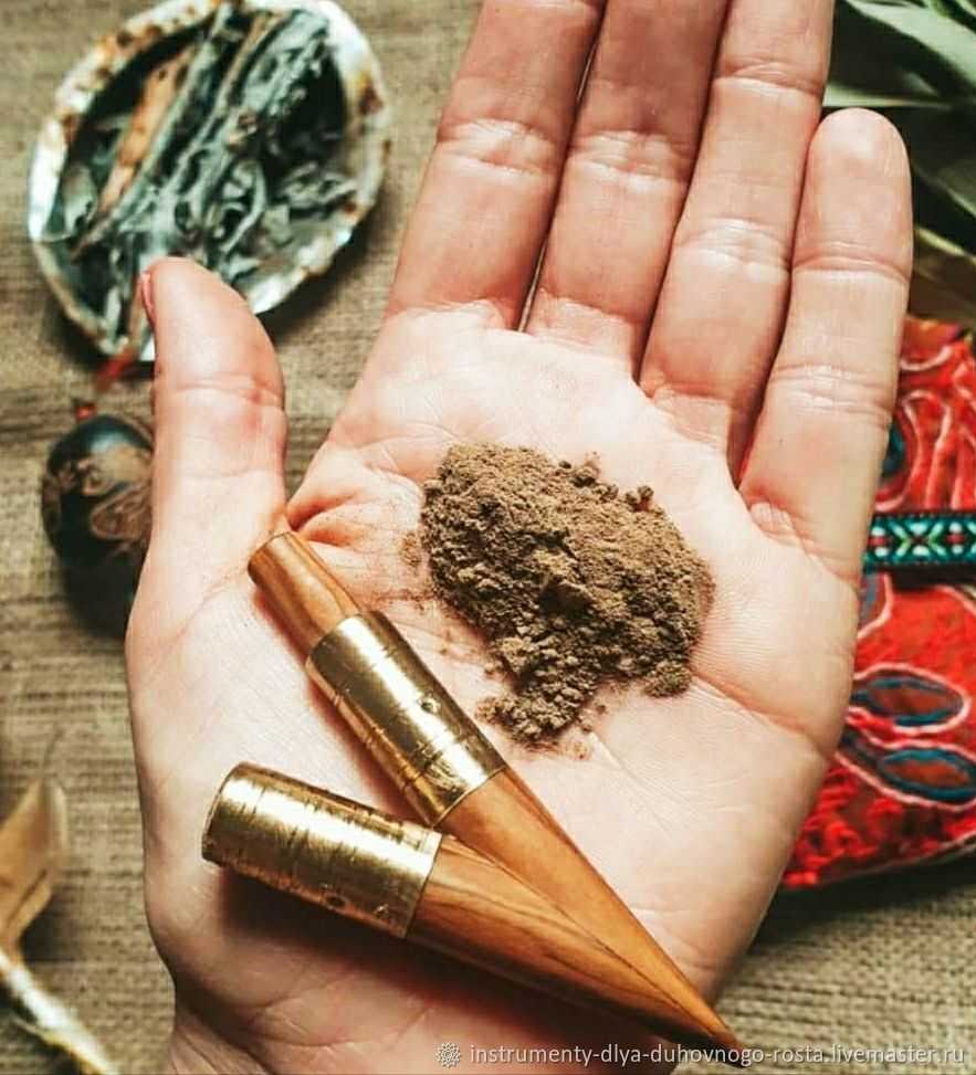Устройтесь в тихом, спокойном месте – лучше всего на природе или в помещении, где играет тихая расслабляющая музыка. Если практикуете в группе, то церемония становится особенным таинством. Каждый человек излучает гармонию в мир, наполняя ею и других. Перед использованием настройтесь на благостное состоянии, успокойтесь, ощутите любовь к себе, к миру и задумайте намерение, если хотите решить для себя важный вопрос. Только после этого можно приступать к вдуванию.
