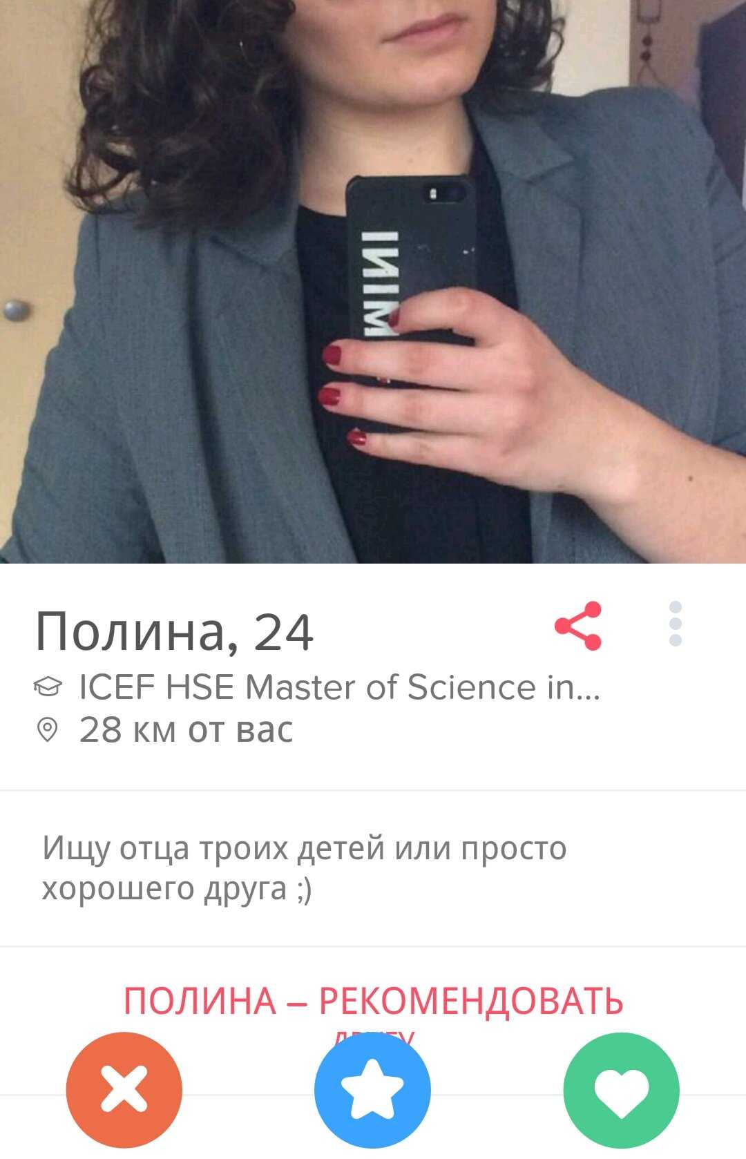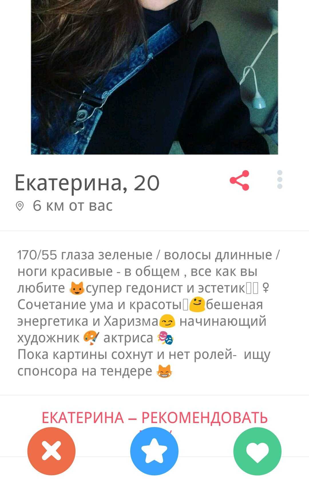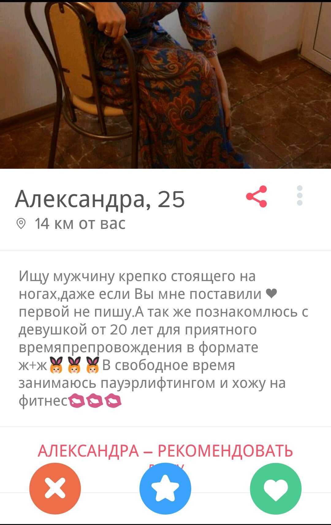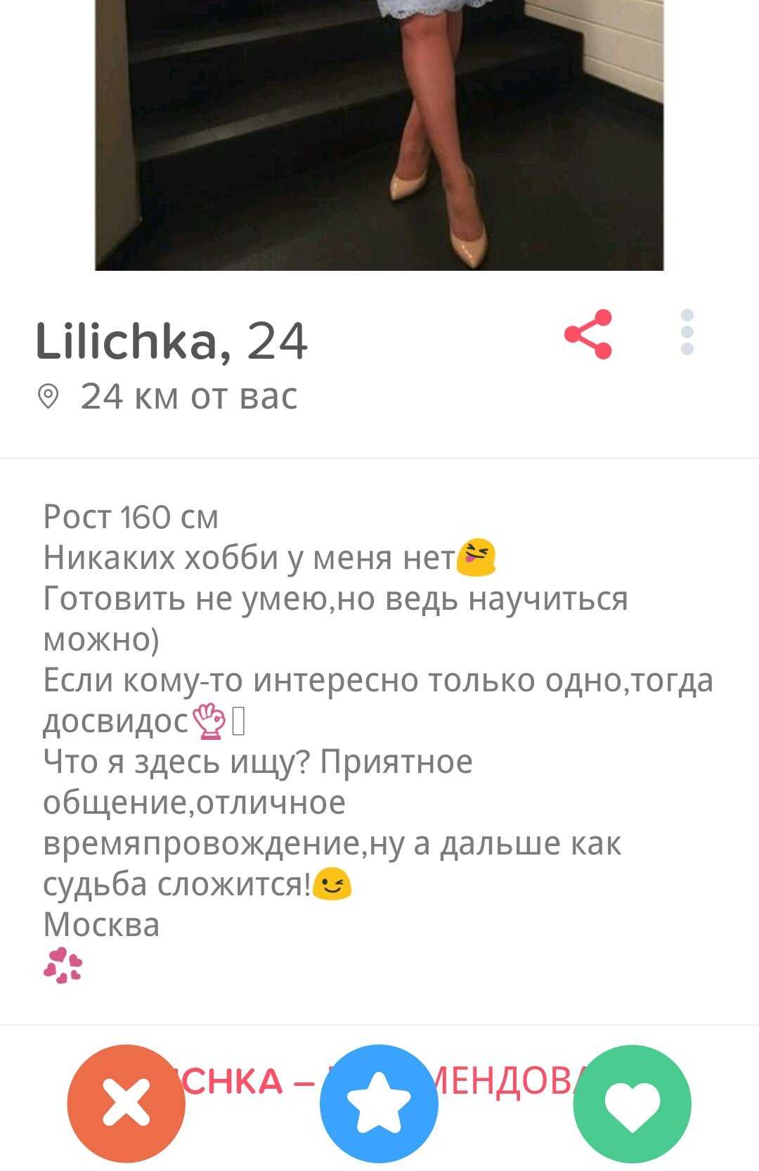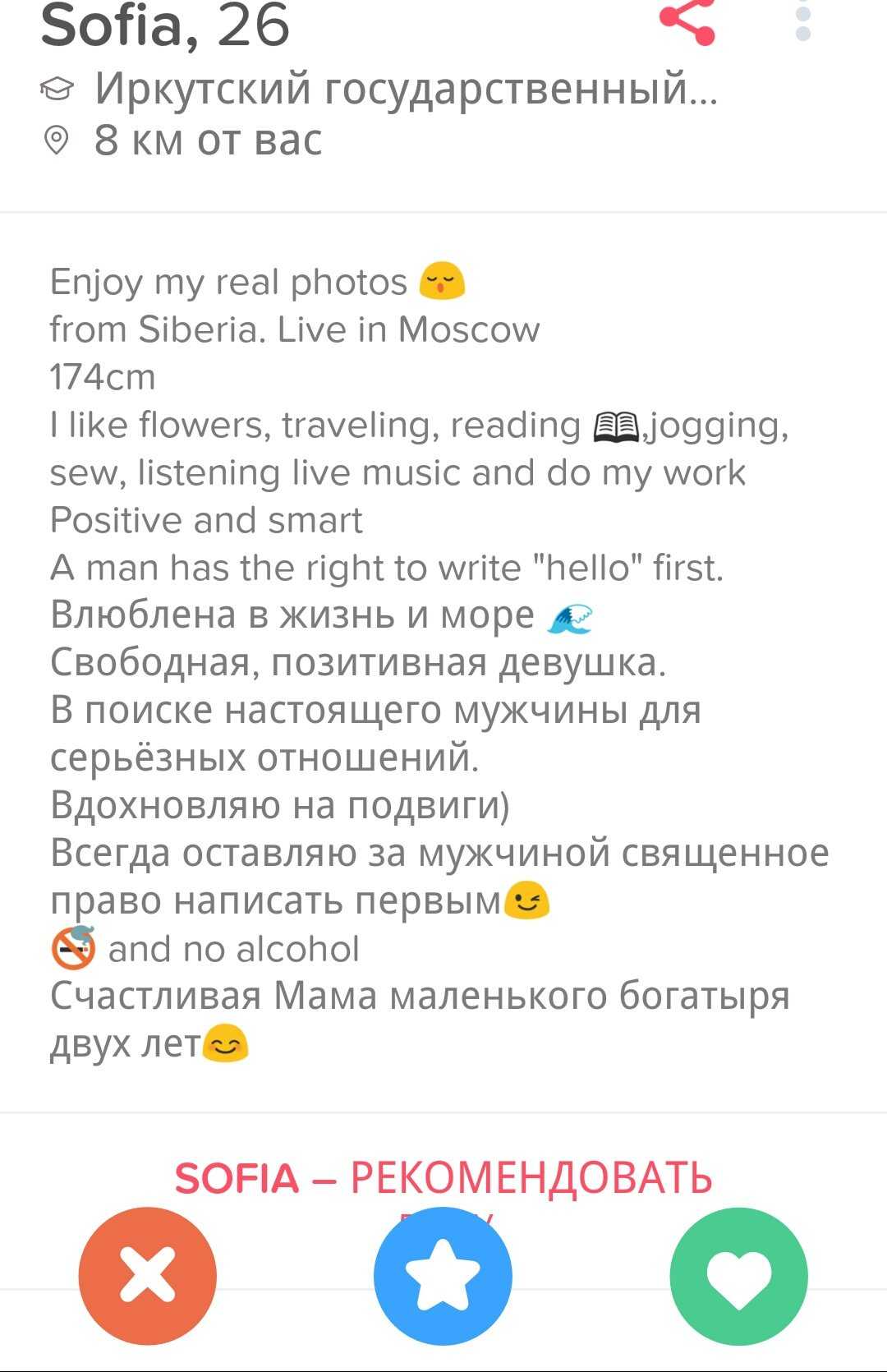 Видимо, иностранцы-то лучше понимают, what Tinder is really about. Что касается иностранок, то тут тоже целый набор критериев, по которым я, например, не подхожу. Зато все предельно конкретно, в анкетах просят далеко не кандидата в мужья. Иностранки описывают критерии для партнера для самого что ни на есть краткосрочного свидания. Это называется «трезво расценивать перспективы» и «ценить свое время». Сливать все в одну кучу — неправильно и приведет совсем не к тем результатам, на которые рассчитывают стороны.