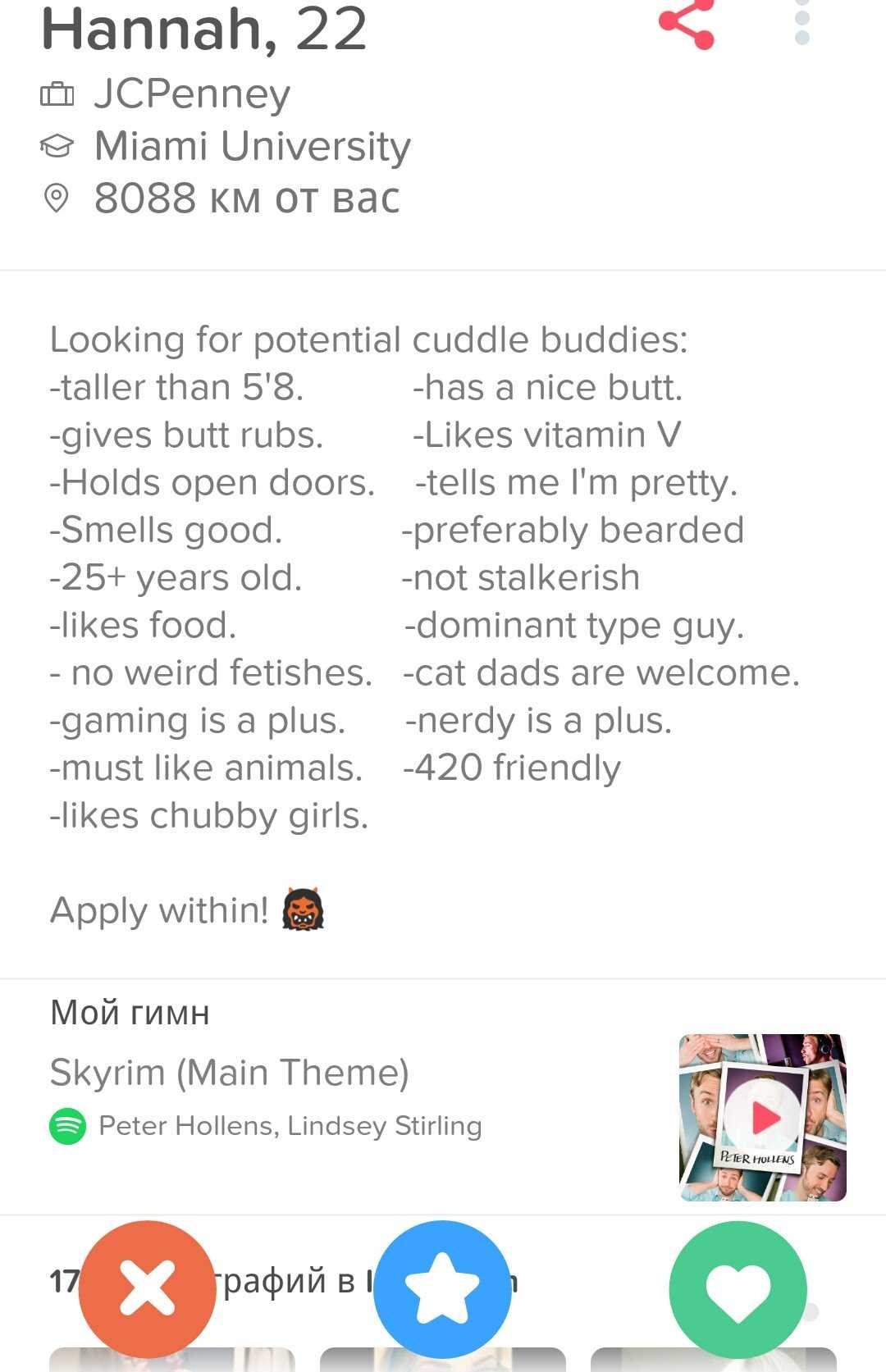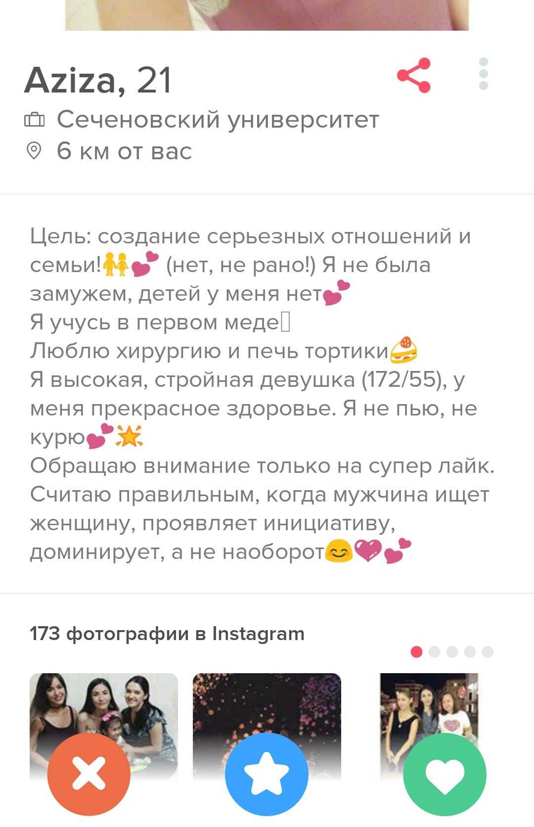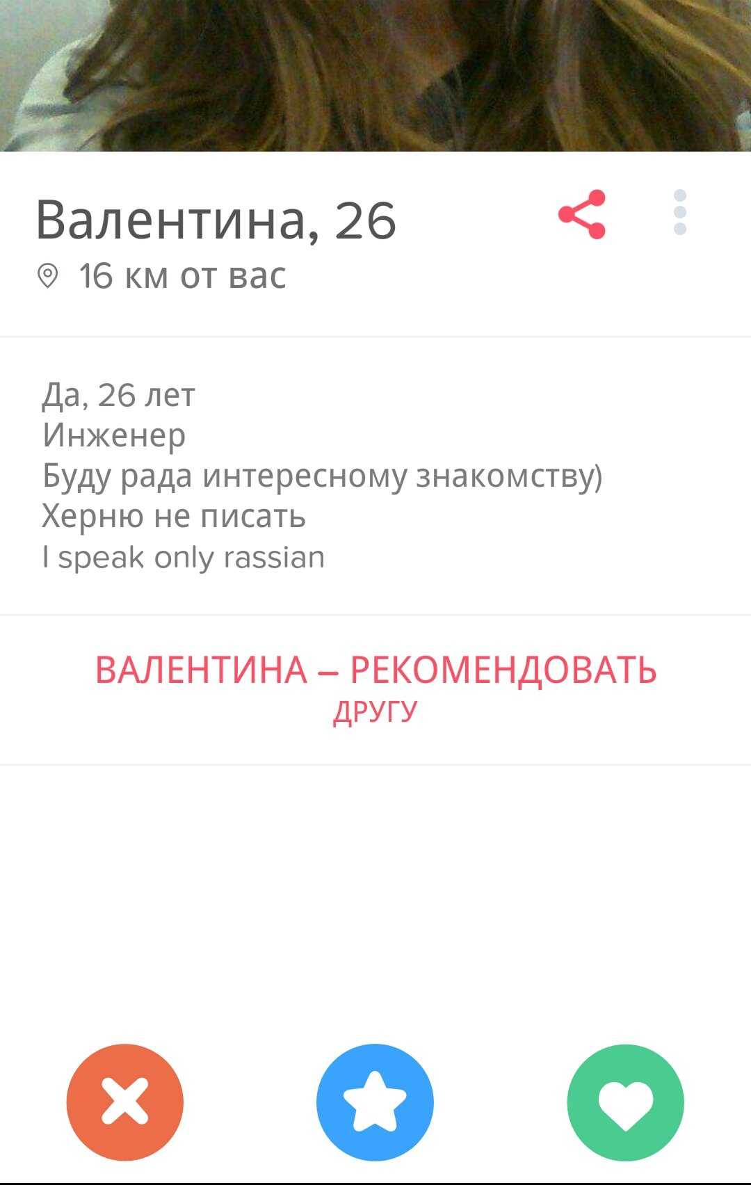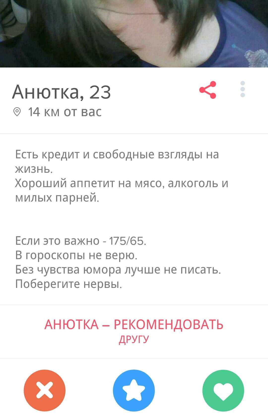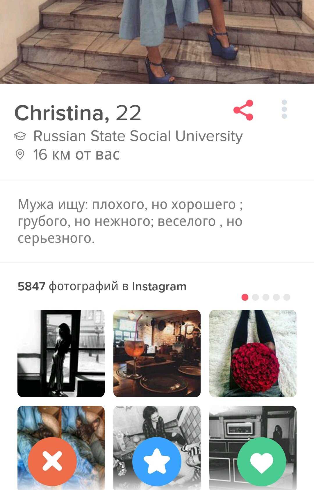 Видимо, иностранцы-то лучше понимают, what Tinder is really about. Что касается иностранок, то тут тоже целый набор критериев, по которым я, например, не подхожу. Зато все предельно конкретно, в анкетах просят далеко не кандидата в мужья. Иностранки описывают критерии для партнера для самого что ни на есть краткосрочного свидания. Это называется «трезво расценивать перспективы» и «ценить свое время». Сливать все в одну кучу — неправильно и приведет совсем не к тем результатам, на которые рассчитывают стороны.