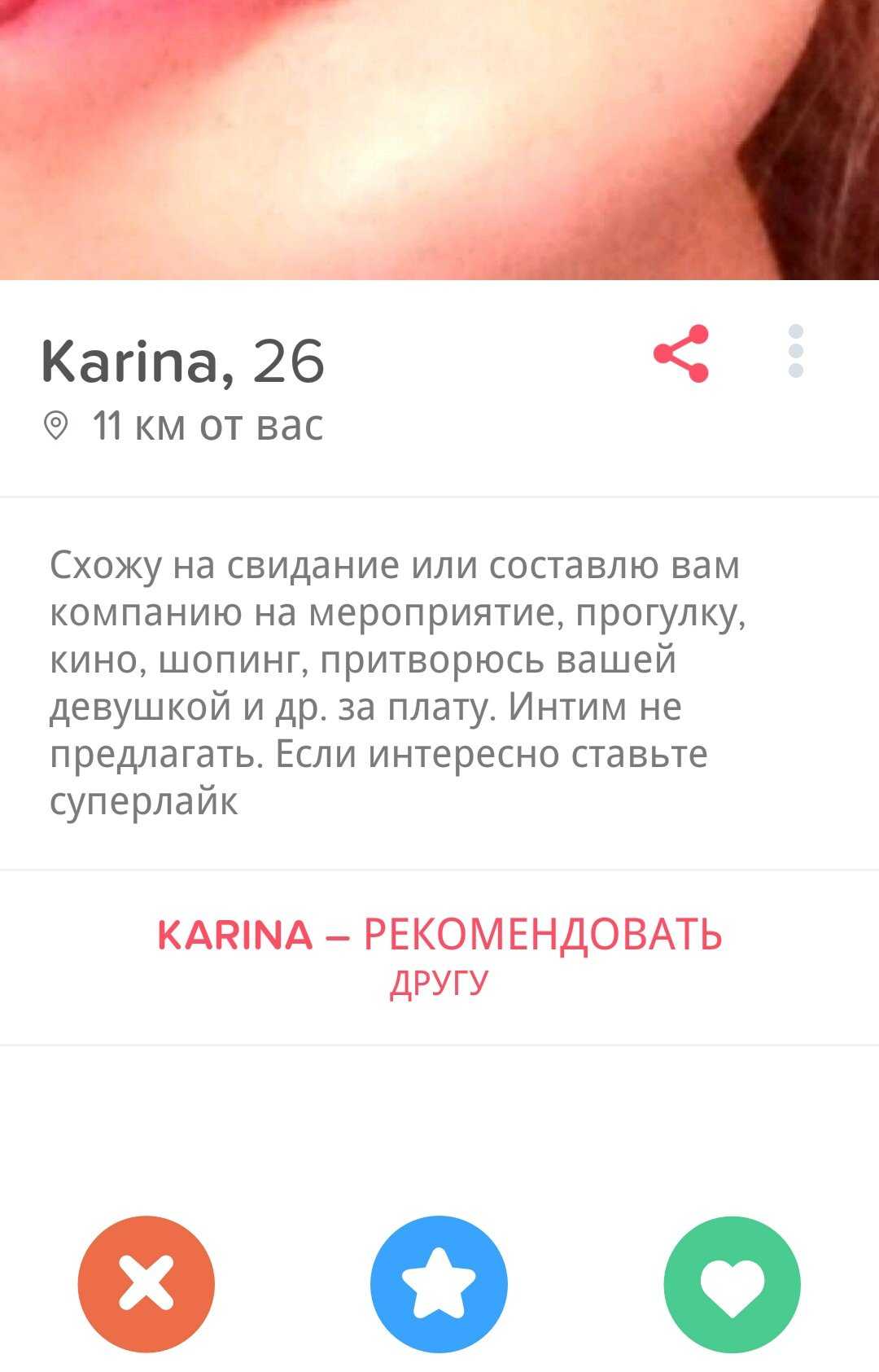 Профиль: имя, возраст, несколько фотографий и не больше 500 знаков на описание себя. Заполнил профиль — иди смотреть каталог. Приглянулась кандидатка — жми вправо, нет — влево. Есть взаимные лайки? Открывается чат. Есть шанс, что понравившаяся девушка никогда тебя не увидит, поэтому можно дать о себе знать суперлайком (раз в сутки). Или заплатить за промоушн своего профиля. Но разве такие простофили существуют?
