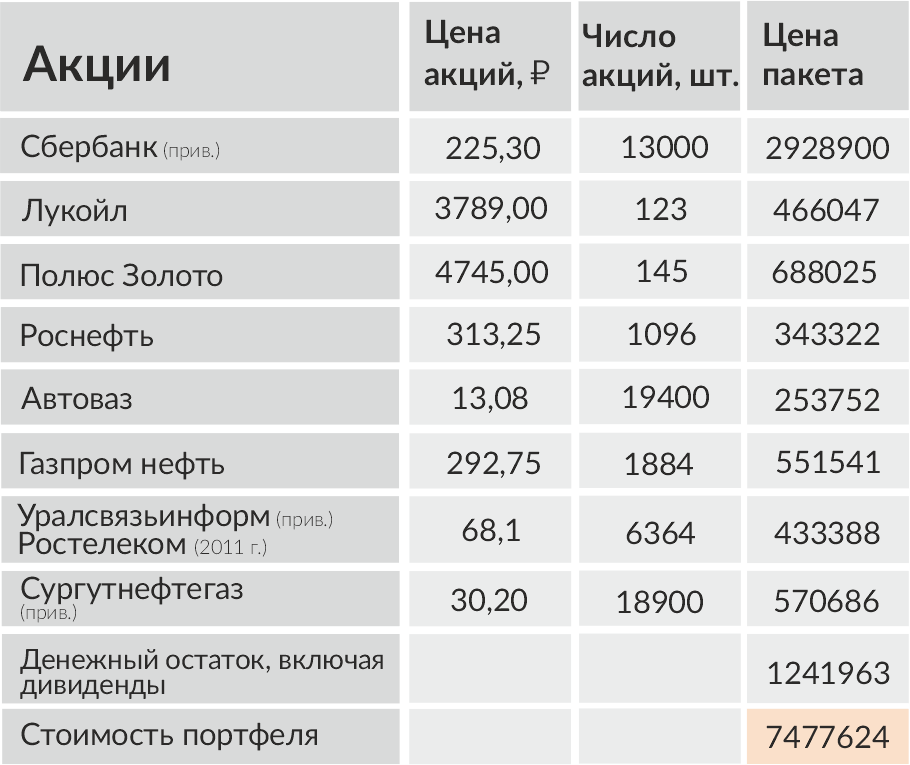 Лукерья потенциально заработала на своем портфеле только в виде дивидендов 1 млн рублей. Стоимость инвестиционного портфеля обезьянки выросла в 7,5 раз — с 1 млн рублей до 7,5 млн рублей.