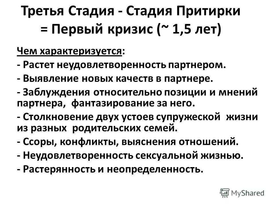 Третья Стадия — Стадия Притирки = Первый кризис (~ 1,5 лет) Чем характеризуется: — Растет неудовлетворенность партнером. — Выявление новых качеств в партнере. — Заблуждения относительно позиции и мнений партнера, фантазирование за него. — Столкновение двух устоев супружеской жизни из разных родительских семей. — Ссоры, конфликты, выяснения отношений. — Неудовлетворенность сексуальной жизнью. — Растерянность и неопределенность.
