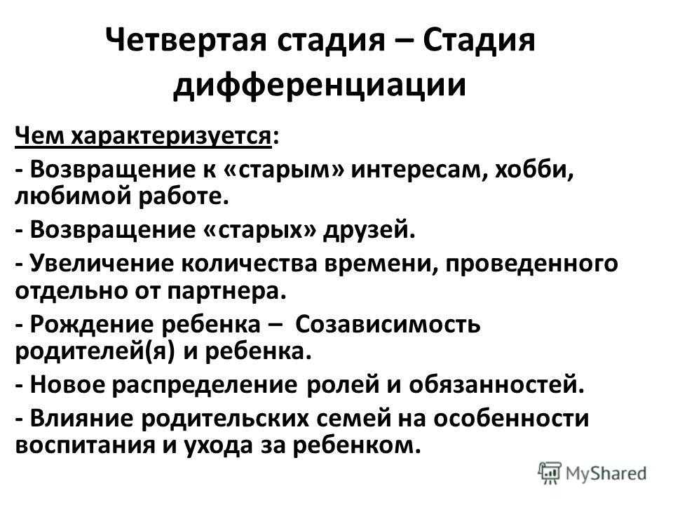 Четвертая стадия – Стадия дифференциации Чем характеризуется: — Возвращение к «старым» интересам, хобби, любимой работе. — Возвращение «старых» друзей. — Увеличение количества времени, проведенного отдельно от партнера. — Рождение ребенка – Созависимость родителей(я) и ребенка. — Новое распределение ролей и обязанностей. — Влияние родительских семей на особенности воспитания и ухода за ребенком.