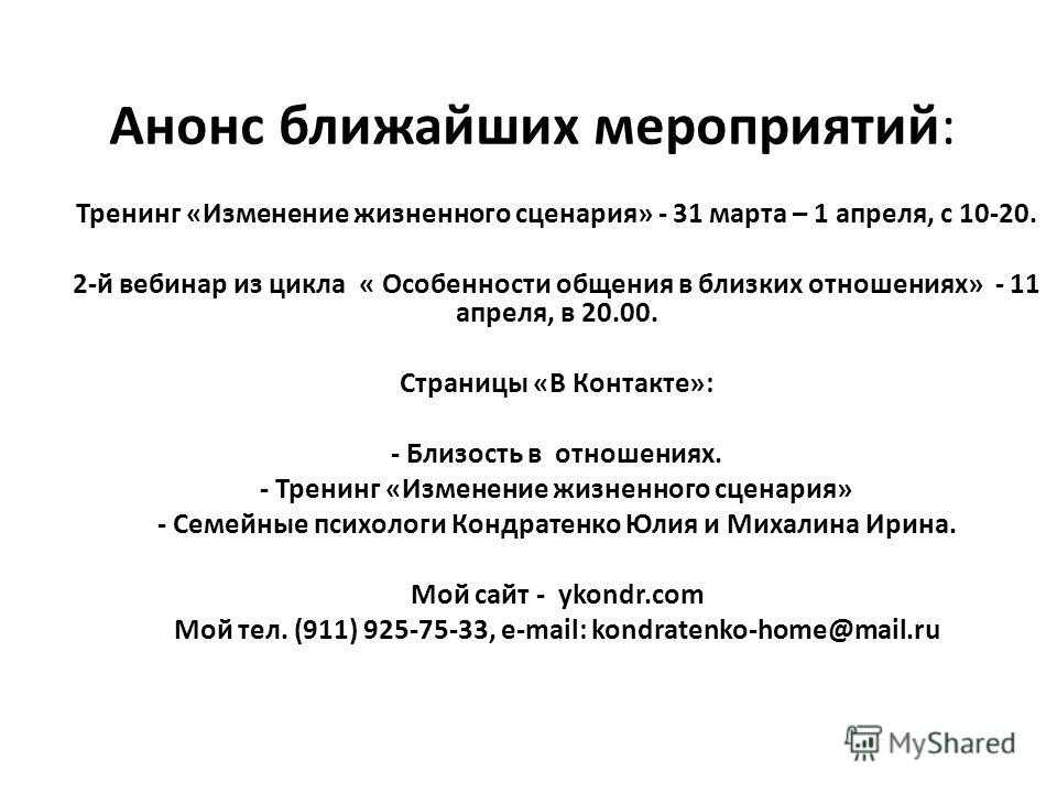 Анонс ближайших мероприятий: Тренинг «Изменение жизненного сценария» — 31 марта – 1 апреля, с й вебинар из цикла « Особенности общения в близких отношениях» — 11 апреля, в Страницы «В Контакте»: — Близость в отношениях. — Тренинг «Изменение жизненного сценария» — Семейные психологи Кондратенко Юлия и Михалина Ирина. Мой сайт — ykondr.com Мой тел. (911) ,