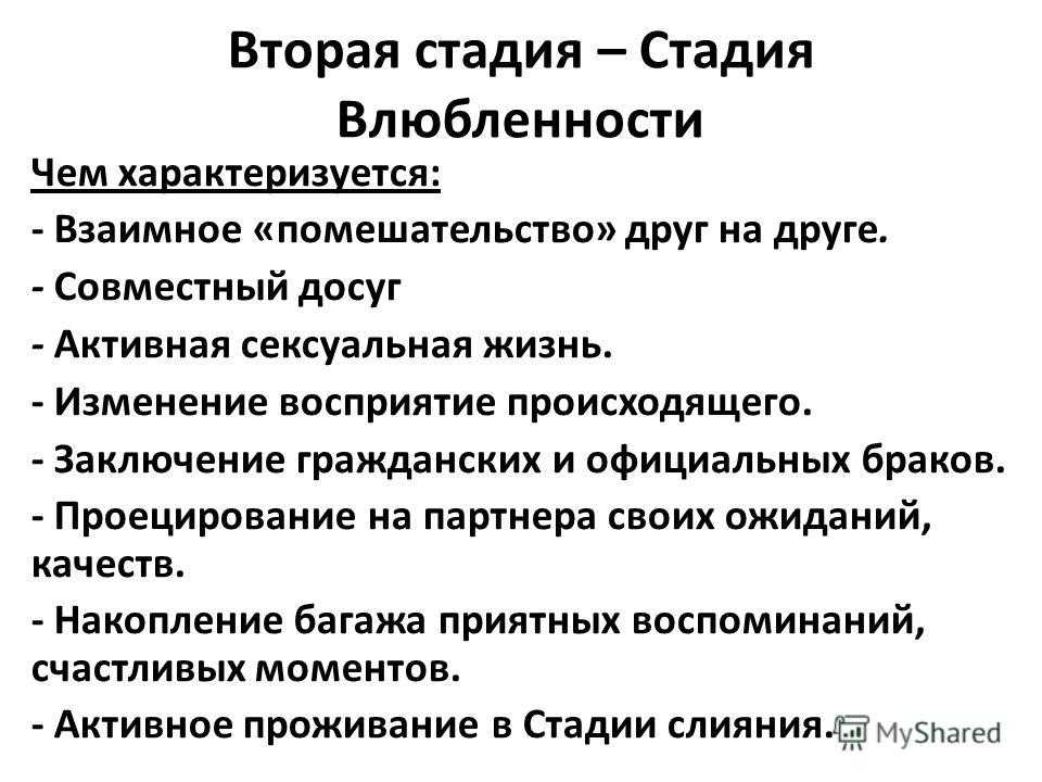 Вторая стадия – Стадия Влюбленности Чем характеризуется: — Взаимное «помешательство» друг на друге. — Совместный досуг — Активная сексуальная жизнь. — Изменение восприятие происходящего. — Заключение гражданских и официальных браков. — Проецирование на партнера своих ожиданий, качеств. — Накопление багажа приятных воспоминаний, счастливых моментов. — Активное проживание в Стадии слияния.