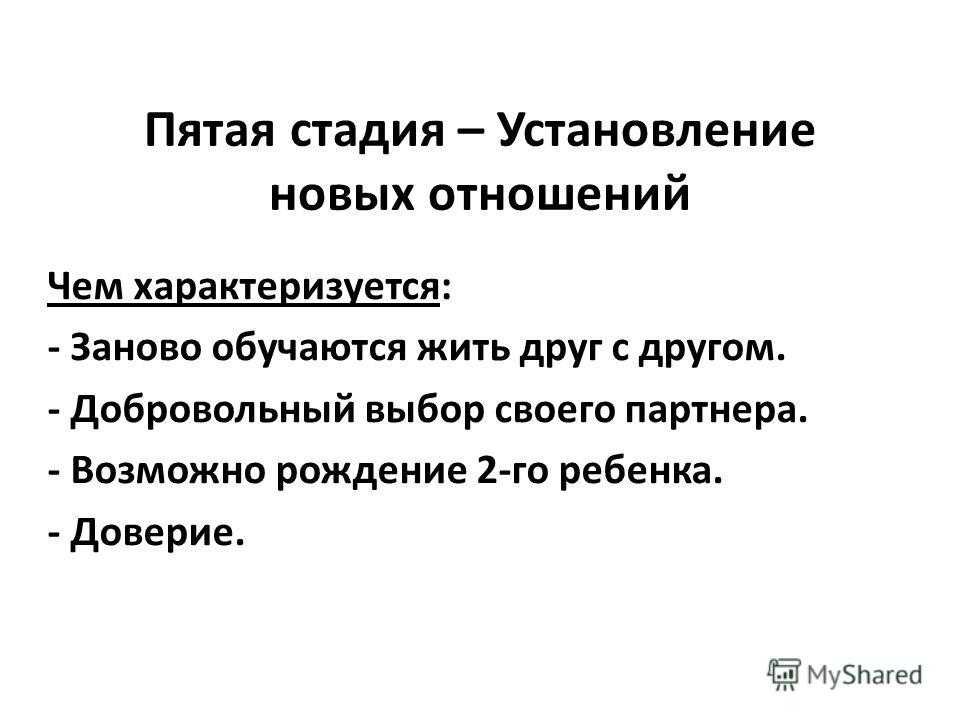 Пятая стадия – Установление новых отношений Чем характеризуется: — Заново обучаются жить друг с другом. — Добровольный выбор своего партнера. — Возможно рождение 2-го ребенка. — Доверие.