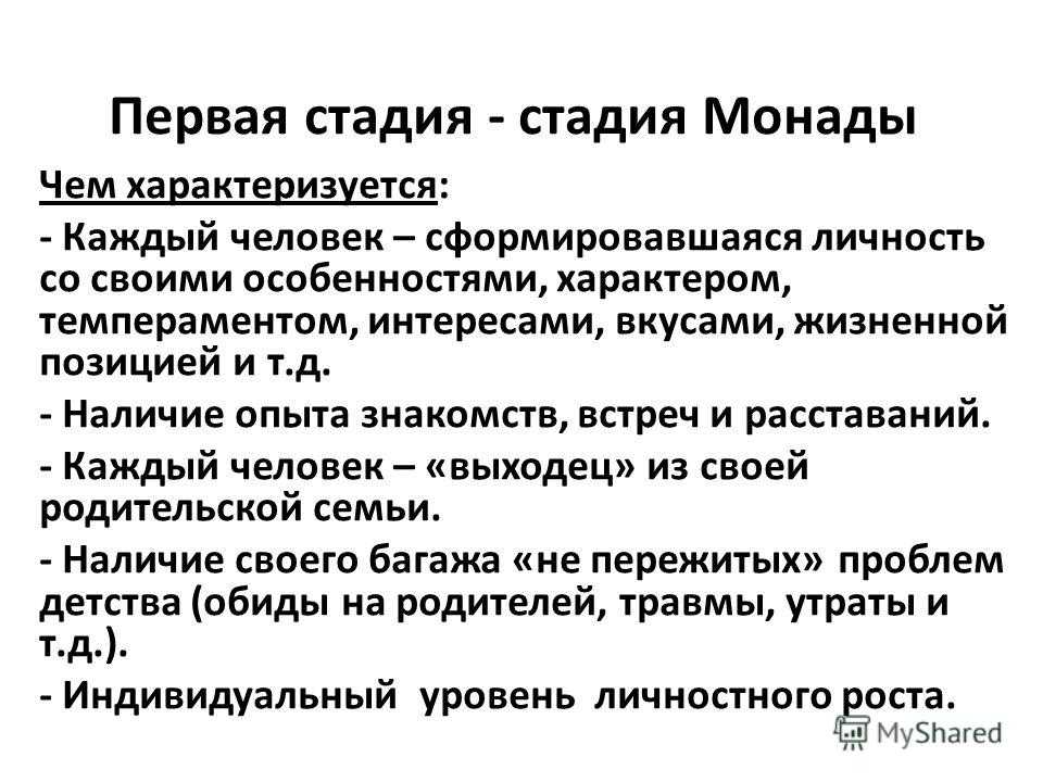 Первая стадия — стадия Монады Чем характеризуется: — Каждый человек – сформировавшаяся личность со своими особенностями, характером, темпераментом, интересами, вкусами, жизненной позицией и т.д. — Наличие опыта знакомств, встреч и расставаний. — Каждый человек – «выходец» из своей родительской семьи. — Наличие своего багажа «не пережитых» проблем детства (обиды на родителей, травмы, утраты и т.д.). — Индивидуальный уровень личностного роста.
