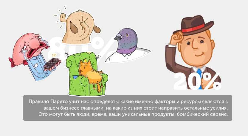 Кстати, закон Парето работает не только в бизнесе и менеджменте, но и в обычной жизни. Из бизнес-учебников этот принцип перекочевал в нашу реальность с легкой руки Ричарда Коха, который начал применять его ко всем сферам жизни. А за ним и весь мир. Но вернемся к бизнесу. Как применять закон Парето? Правило Парето учит нас определять, какие именно факторы и ресурсы являются в вашем бизнесе главными, на какие из них стоит направить остальные усилия. Это могут быть люди, время, ваши уникальные продукты, бомбический сервис — что угодно, зависит от вас и специфики вашего бизнеса. Да, их всего 20 процентов, но именно они принесут вам основные доходы и награды.
